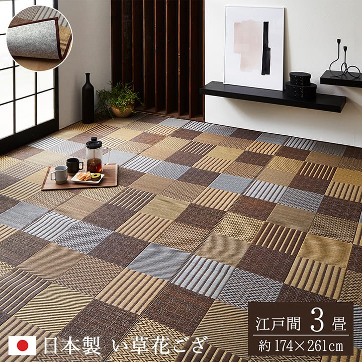 ■ いろいろな織りを組み合わせたパッチワーク風のい草カーペットです。 ■ 織り方によって違う、複数の肌感触をお楽しみいただけます。 ■ 落ち着いた色目でモダンな雰囲気に仕上げました。 ■ 経糸の本数が多い袋織りという技法で繊細な柄を出しています。 ■ 裏地がフェルト貼りなので、フローリングにもやさしくご使用いただけます。 ■ 国産(九州産)のい草を使用しています。一本一本が太く、表皮が厚く繊維がキメ細かいので弾力性があり、耐久性に優れています。 ■ い草には空気の自然浄化作用、湿度の調節作用などがあります。 ■ 青森産天然ヒバから抽出した植物由来成分で抗菌防臭加工をほどこしています。 ■ 希少な国産い草を用いて、ベテラン職人が、長年の経験を活かし、国内工場で丹念に織りあげました。 ■ ご家族のくつろぎの場に、安心して使用いただけます。 # 折りたたんで収納できます。 # 写真は表記サイズと異なる場合がございます。 # 画面上のカラーはご使用ブラウザやモニターの設定により、実物とは若干異なる場合がございます。あらかじめご了承の上、ご注文をお願いいたします。 | |||||