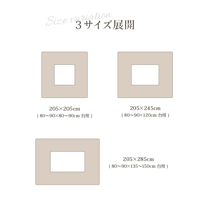 | 205×205cm掛単品 205×245cm掛単品 205×285cm掛単品 205×205cm掛敷セット 205×245cm掛敷セット 205×285cm掛敷セット |