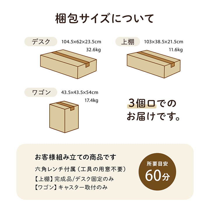 【デスク】104.5×62×23.5cm/32.6kg 【上棚】103×38.5×21.5cm/11.6kg 【ワゴン】43.5×43.5×54cm/17.4kg |