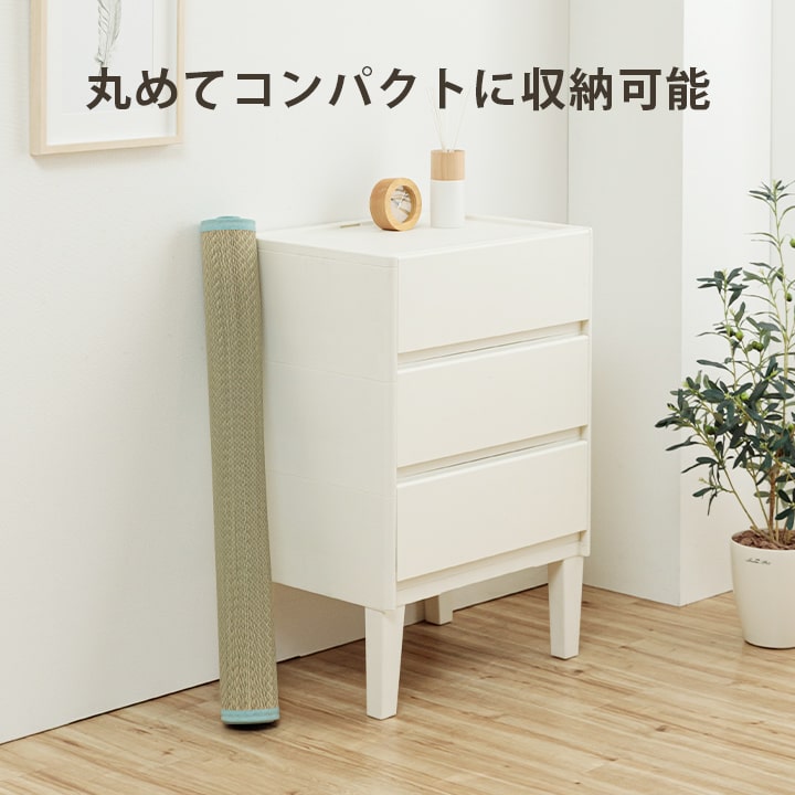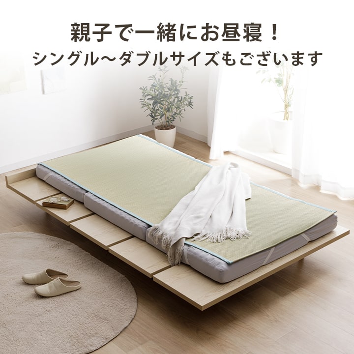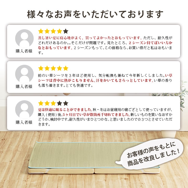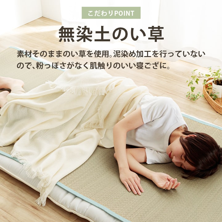 その作業をしない無染土い草を使用した商品です。泥染め加工を行ったい草とは違い、素材そのままのい草ですから、粉っぽさもなく、ほこりがたちにくく、肌触りが良いので快適な睡眠をサポートします。
