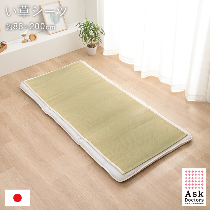 | ■ 医師60名の意見・アイデアから快適な睡眠をサポートするい草寝具をメーカーと共同開発した「アスクドクターズ」シリーズ。長時間、肌に接する寝具だからこそ、自然素材を使い、やわらかな質感にこだわりました。 ■ 国産(九州産)のい草を使用した敷きパッドです。一本一本が太く、表皮が厚く繊維がキメ細かいので弾力性があり、耐久性に優れています。 ■ い草を刈り取った後に行われる、泥染めという工程を省き、素材そのままの無垢のい草を使用しています。粉っぽさがなく、すべすべとした滑らかな肌触りに仕上げました。 ■ 四隅にゴムバンドが付いており、ずれにくくなっています。 ■ い草には吸湿力・調湿効果があり、汗を吸収してさらっと快適な睡眠をサポートします。 ■ 快眠い草の効能として 1.綿の約2.5倍の吸湿力 2.蒸れにくい。汗による湿気を吸うことにより温度を下げ快適な就寝を促します。 3.汗のにおいを軽減。汗のにおいの元となる化学物質を90%以上抑えます。 などがあります。暑苦しい日本の夏でも汗のジメジメを軽減してくれます。 |