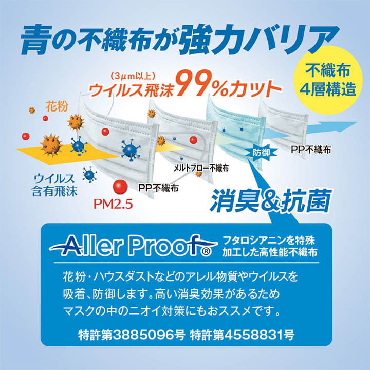 | ■大気汚染物質「PM2.5」にも対応 ■PM2.5とは、2.5μm以下の粒子です。 ■アレルキャッチャーマスクは、0.1μmの粒子なら99%カットするフィルターを使用しています。 ※微粒子捕集効率(PFE)99% [測定]カケンテストセンター ■フタロシアニン加工不織布には、硫黄酸化物や窒素酸化物を吸着・防御する能力もあります。 ※PM2.5には0.1μm以下の粒子が含まれている可能性があります。 ■抗アレル物質機能があります。 ■花粉の粒子をフィルターで阻止するだけでなく、アレル物質を吸着する機能もあります。 ■花粉対策にオススメです。 ■マスクにイヤなニオイが残りません。口臭や、タバコのニオイがマスクに付着するのを軽減します。 |