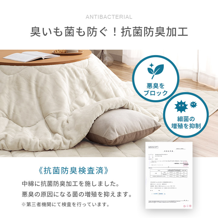 【表地】ポリエステル100%(フランネル) 【裏地】ポリエステル100%(フランネル) 【中材】中空ポリエステル綿100%(抗菌防臭加工)1.4kg |