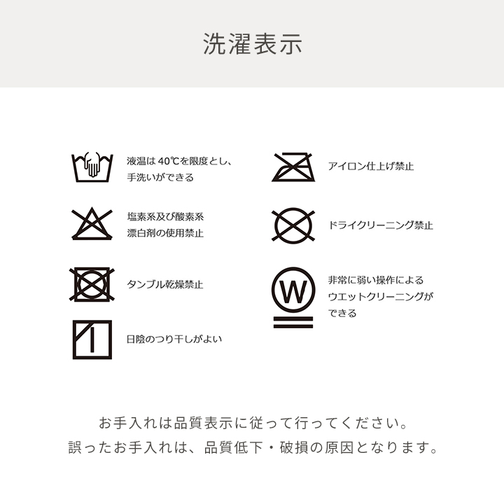 | 液温は40℃を限度とし、手洗いができる。(洗濯機は使用できません) 日陰のつり干しがよい。 |