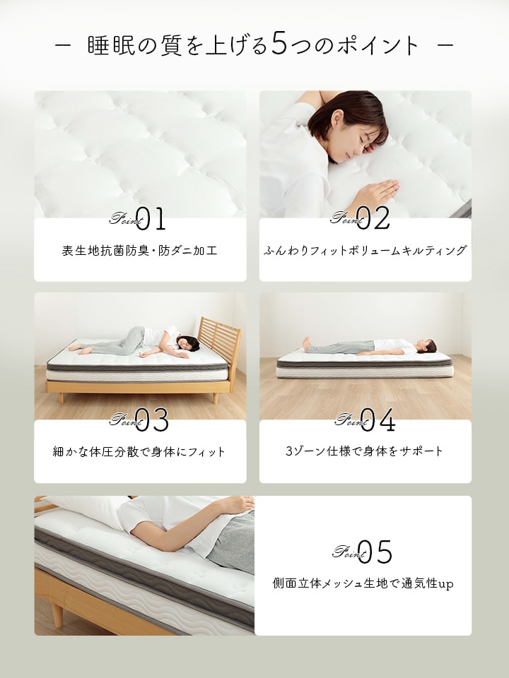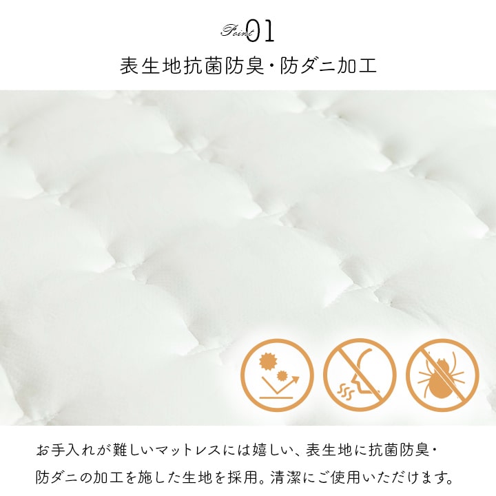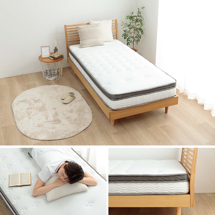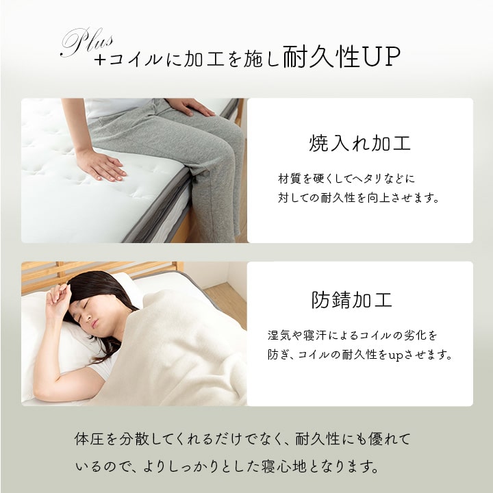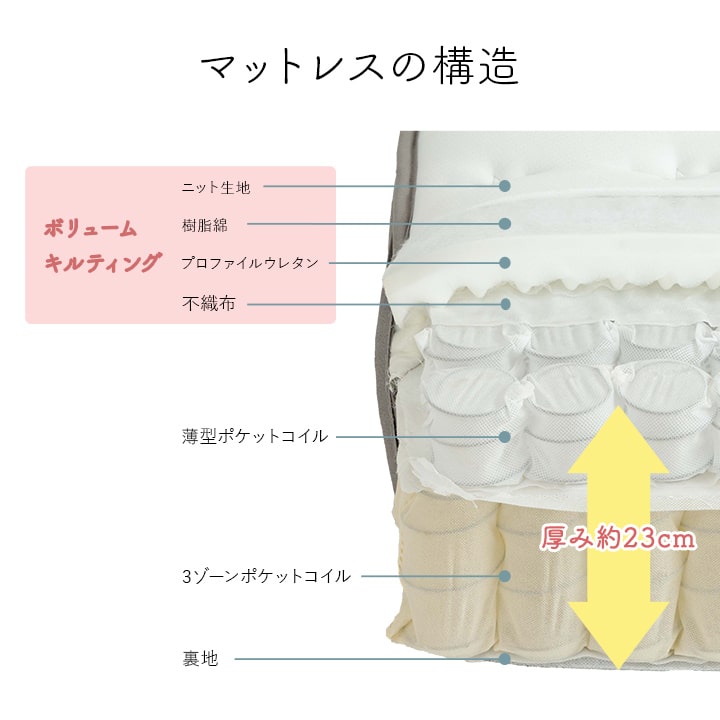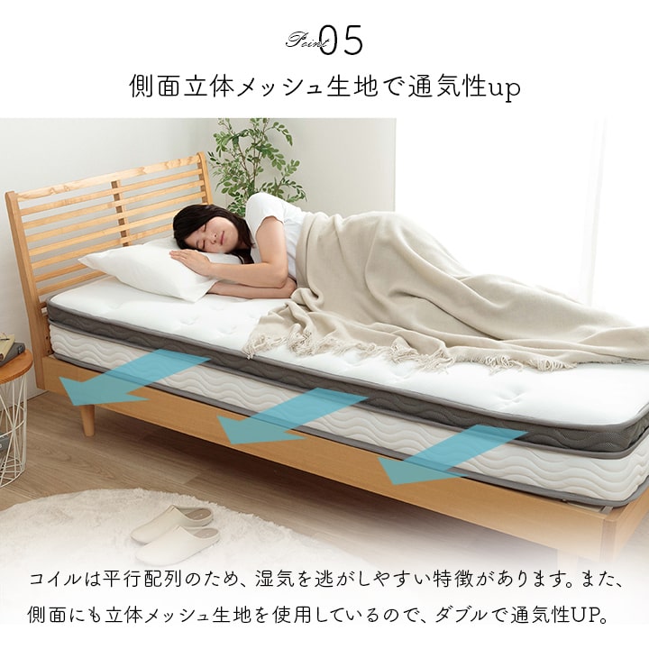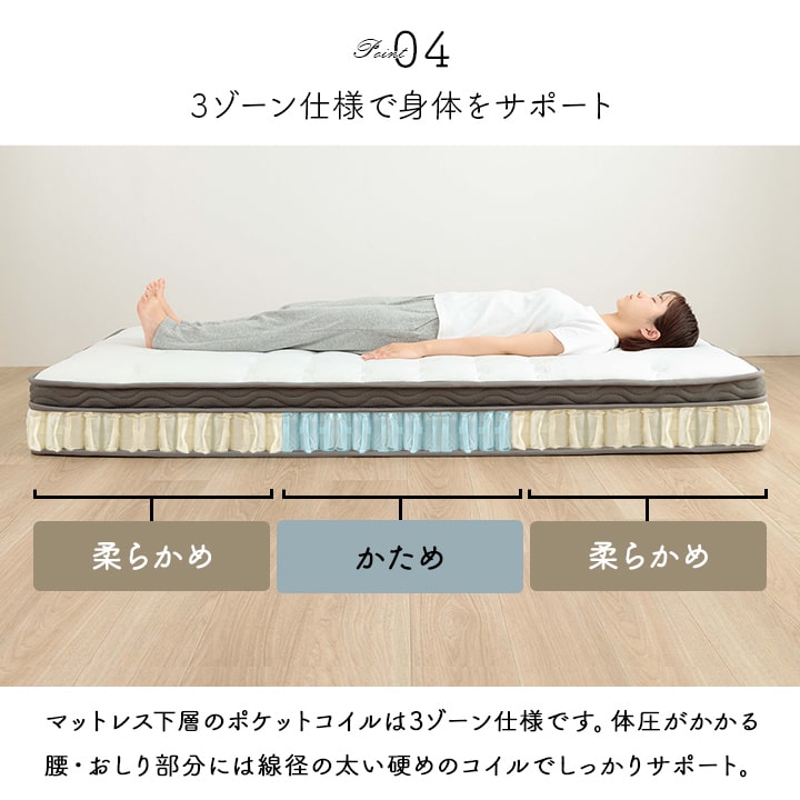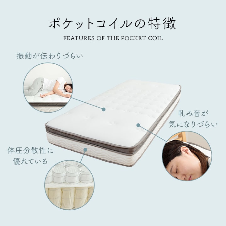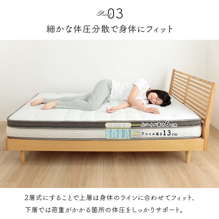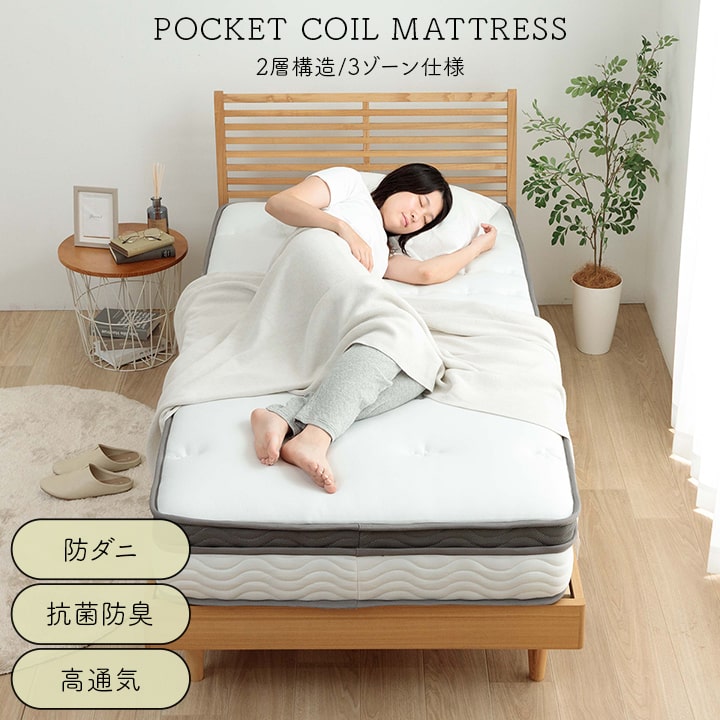 | ■身体を点で支え、体圧分散に優れたポケットコイルマットレス。 ■2層式のコイルマットレスで上層はより細かい部分までの体圧を分散。下層部分のポケットコイルは3ゾーン仕様で、耐圧がかかる腰・臀部部分には硬めで線径の太いコイルでしっかりサポートします。 ■側面は通気性の良い3Dメッシュ。 ■寝ている時にコイルあたりの少ない樹脂綿と通気性のあるプロファイルウレタンを加えたボリューム23cm。 ■耐久性、通気性に優れた並行配列コイル。 ■ISO9001認定工場で生産した安心の品質。 ■圧縮梱包だから、搬入もラクラク! ■表面の生地には抗菌防臭・防ダニ加工!! ■マットレスを清潔に保ち、寝心地をよくするために、ベッドパットのご使用をお薦めします。マットレス自体は布団のように簡単に干したり洗うことができないので、パッドやシーツをこまめに洗うのがポイントです。 ■湿気対策アイテムとして、除湿シートのご使用をお薦めします。除湿シートを使用することで一定の効果がありますが、お部屋の環境や発汗量によって、こまめなお手入れが必要になります。 ■梱包サイズ(約):幅38cm×奥行38cm×高さ144cm ■梱包重量(約):42kg |