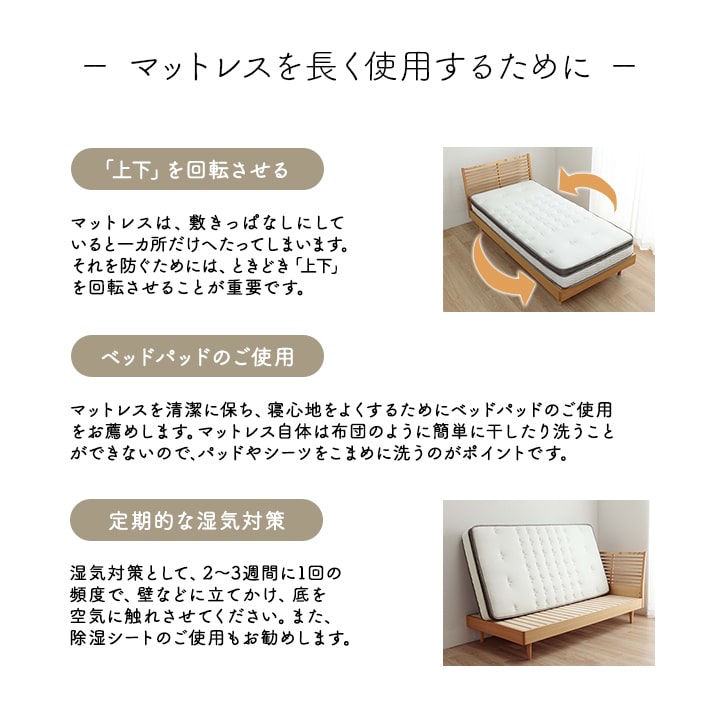 | ※マットレスの水洗いはお避けください。マットレスが汚れた場合、薄めの石鹸水をつけた布で軽く叩くように拭き取り、日陰に干して下さい。 ※臭いが気になる場合は、風通しの良いところで日陰干しをすると多少解消されます。 ※マットレスの上や下に、除湿シートを敷いている場合は、除湿効果を持続させるためにも、2〜3週間に1回の頻度で取り出し、天日干しするとよいでしょう。 また、マットレスの裏側にも湿気は溜まります。同じく2〜3週間に1回の頻度で壁などに立てかけ、マットレスの底を空気に触れさせてください。 ※無理に折り曲げないでください。 ※マットの上で飛んだり跳ねたりしないでください。 |