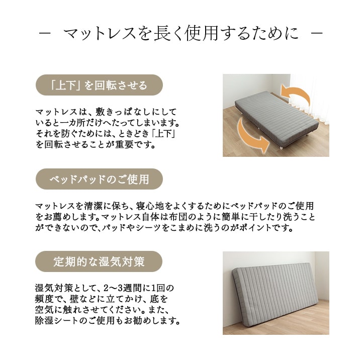 | ※マットレスの水洗いはお避けください。マットレスが汚れた場合、薄めの石鹸水をつけた布で軽く叩くように拭き取り、日陰に干して下さい。 ※臭いが気になる場合は、風通しの良いところで日陰干しをすると多少解消されます。 ※マットレスの上や下に、除湿シートを敷いている場合は、除湿効果を持続させるためにも、2〜3週間に1回の頻度で取り出し、天日干しするとよいでしょう。 また、マットレスの裏側にも湿気は溜まります。同じく2〜3週間に1回の頻度で、壁などに立てかけ、マットレスの底を空気に触れさせてください。 ※無理に折り曲げないでください。 ※マットの上で飛んだり跳ねたりしないでください。 |