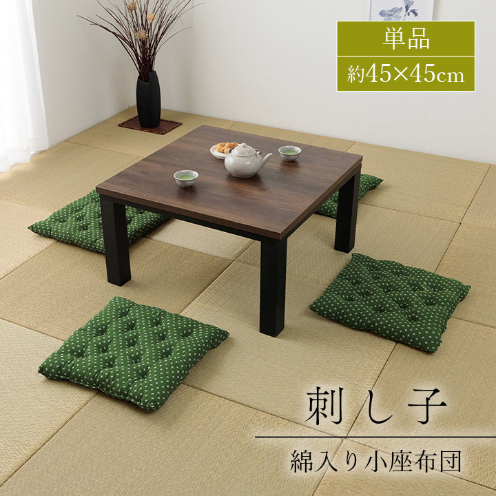 | ■綿の産地インド綿生地を使用しており、季節を選ばずオールシーズンお使いいただけます。 ■小さめ座布団サイズ。13か所ピン留めをしているので綿が寄りにくいのが特長です。 ■伝統のある刺し子の風合いは、和室だけでなくフローリングにも合う柄なので、場所を選ばずご使用いただけます。 |
