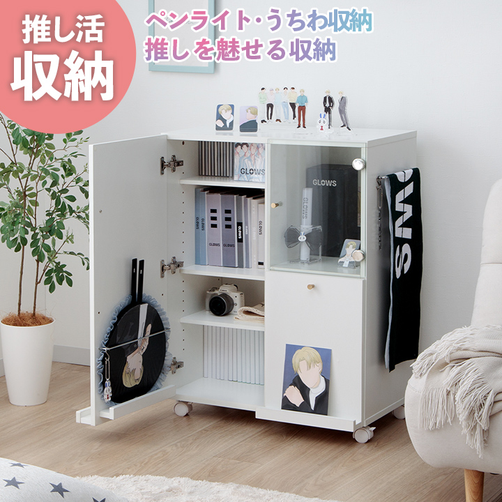 | ■強化ガラスの扉部分は、グッズに埃を被ることなく飾れて、いざという時も安心です。 ■強化ガラスの扉部分は、高さ30cmのペンライトの箱も収納いただけます。 ■魅せたいものと隠したいものを選んで収納することができます。 ■天板部分は、推しを飾って毎日推しを拝めます。ミラーやアクセサリーを置いておしゃれなスペースとしてもお使いいただけます。 ■ポスター収納スペースには、ペンライトやスローガンも収納できて、スリムタイプのみポスター大サイズ(51×72cm)も収納できます。 ■ポスター収納スペースは、用途に合わせて間切り板を取り外し、他のグッズも収納いただけます。 ■ワイドタイプには、扉裏に横幅30cmのうちわも収納可能です。またバーの位置は、2つの高さから選べるのでうちわの大きさに合わせて設置いただけます。 ■横側には、サイドハンガーが付いており、タオルやキーホルダーをかけれます。 ■S字フックが3個付属しているため、サイドハンガーにS字フックをかけると、トートバッグやキーホルダーも飾れます。 ■扉部分には、ディスプレイスペースが付いているので、推しが表紙の雑誌やCDを飾れます。 ■お好みでキャスターを付けられるので、模様替えやお掃除も簡単です。ストッパーも付いているので、使用時はしっかり固定することができます。 ■スリムな奥行きのため、お部屋を圧迫せずスッキリ見せることができます。 ■沢山収納できるので、グッズ以外にも日用品なども収納いただけます。 ■可動棚は、ワイドタイプ19段階、スリムタイプ10段階あり、ピッチ3cmで細かく高さを変えられます。 ■組立の際には、あらかじめプラスドライバーの大と小のご準備をお願いいたします。電動ドライバーもあると作業がしやすくなります。 |