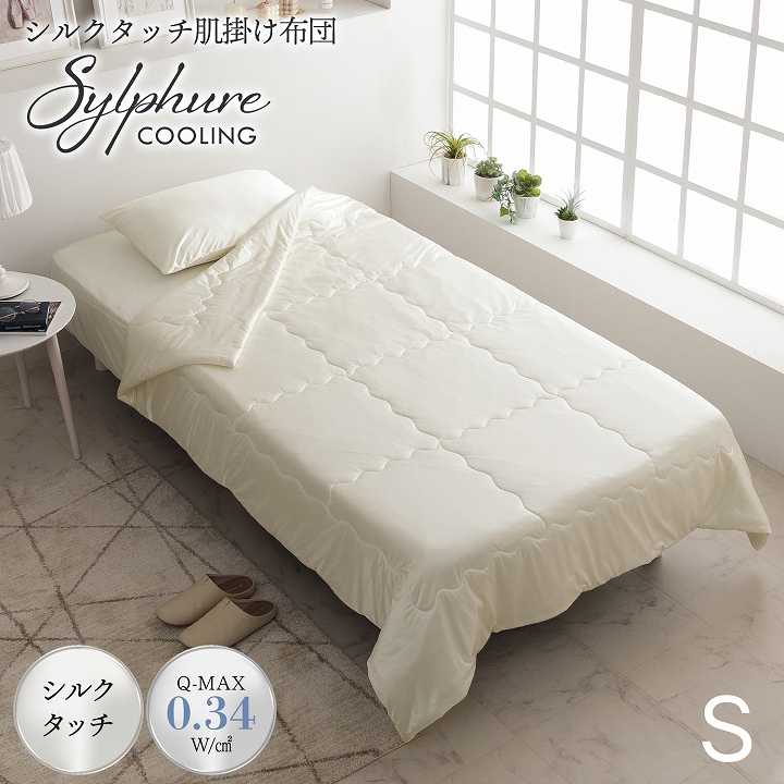| ■まるでシルクのようななめらかな肌触りの肌掛け布団です。 ■ひんやり感のある糸を組み合わせて織り上げた接触冷感生地を使用しています。 ■やわらかさとなめらかさで体にしっかり沿うフィット感です。 |