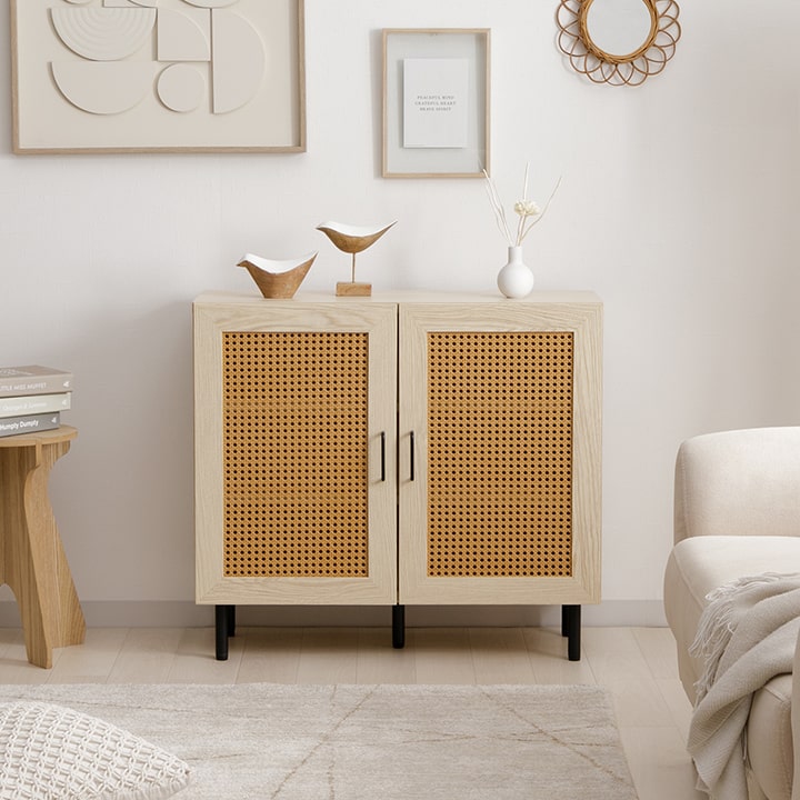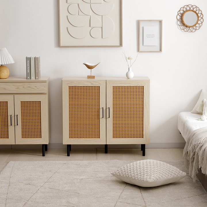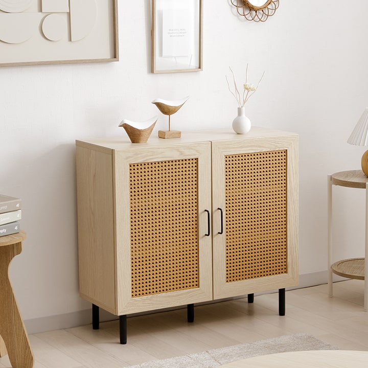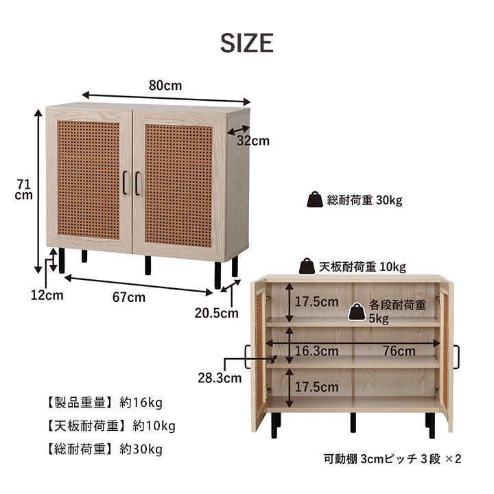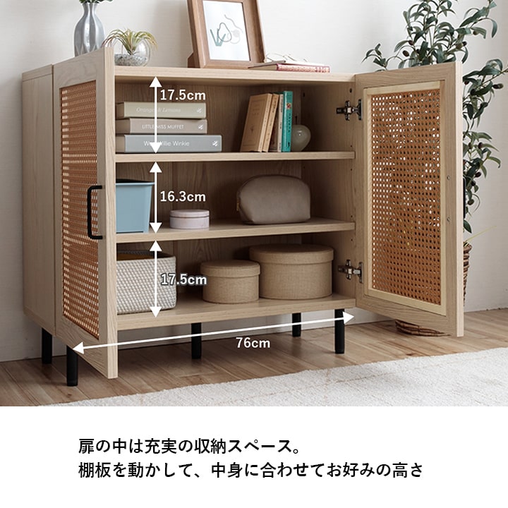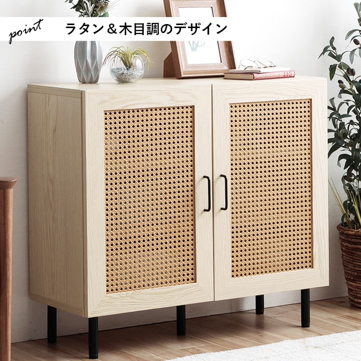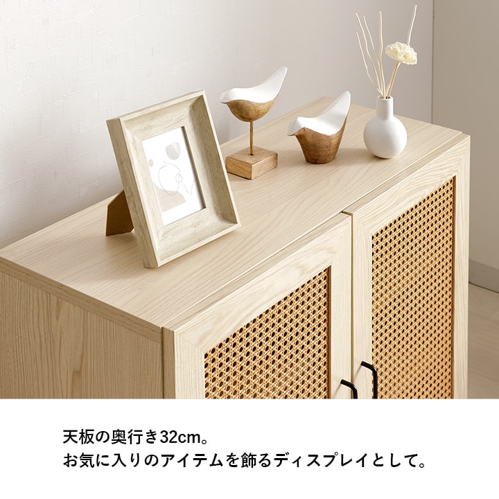 | ■ お部屋に自然と馴染む、おしゃれな「かごめ編み」のラタン調キャビネット。 ■ 扉内の収納は、3cm間隔で調整できる可動棚になっており、用途に応じて高さを変更可能。 ■ 天板の奥行きは32cmあり、ディスプレイスペースとしても使用できます。 ■ 脚部はマットな質感のスチール製。付属のアジャスターにより高さ調整可能。 ■ 本製品はお客様ご自身での組立が必要です。 ■ 耐荷重は全体で約30kg、天板部分は約10kg、その他の板は約5kgです。 |