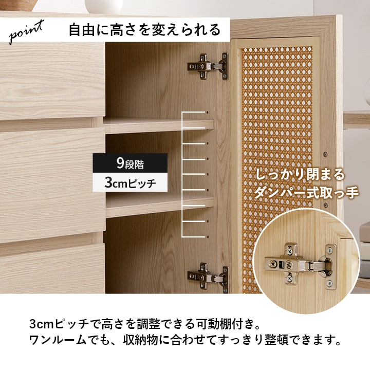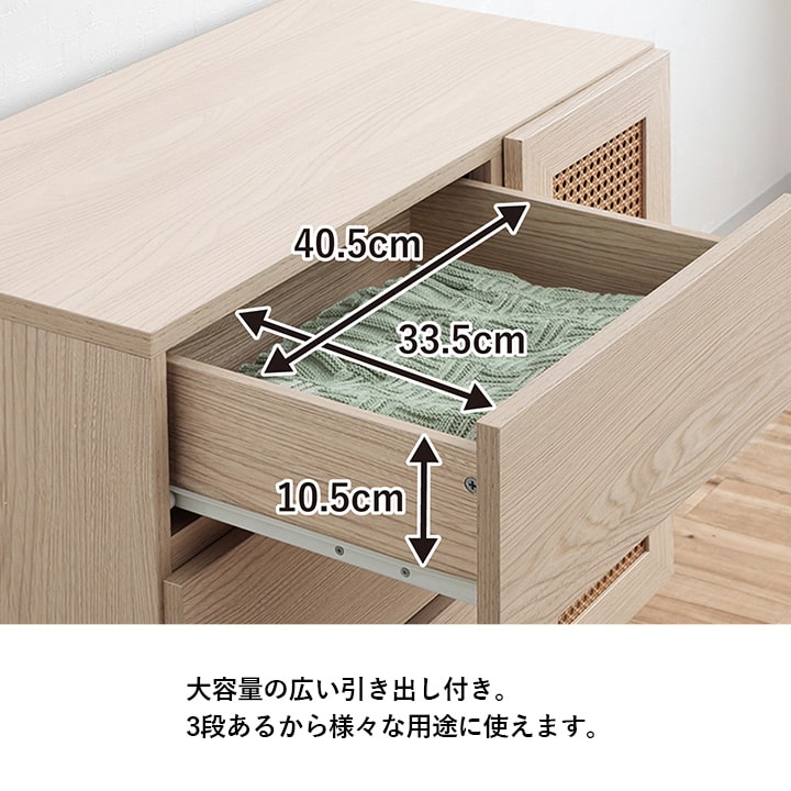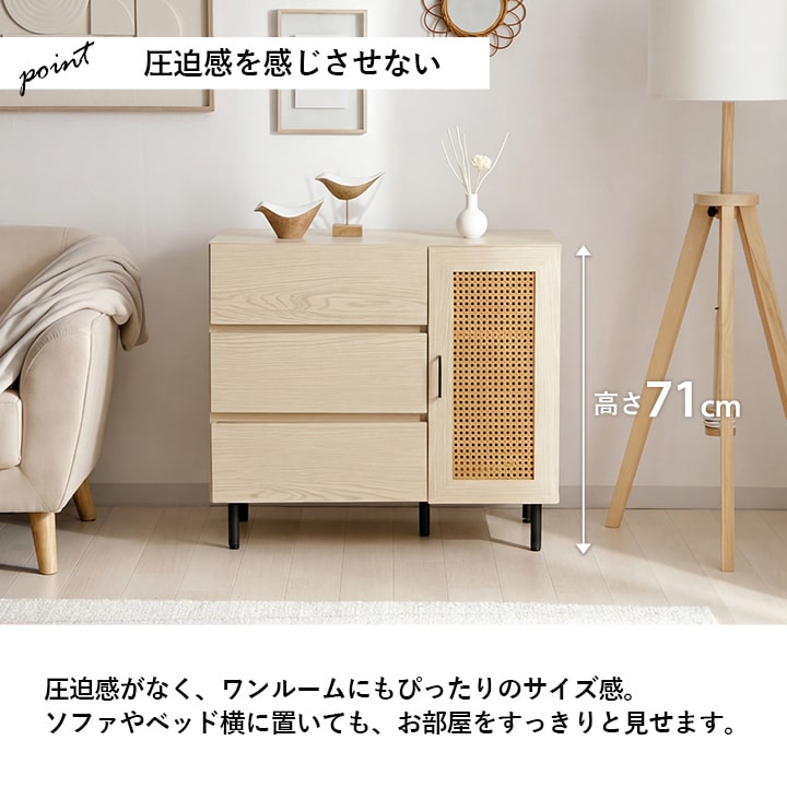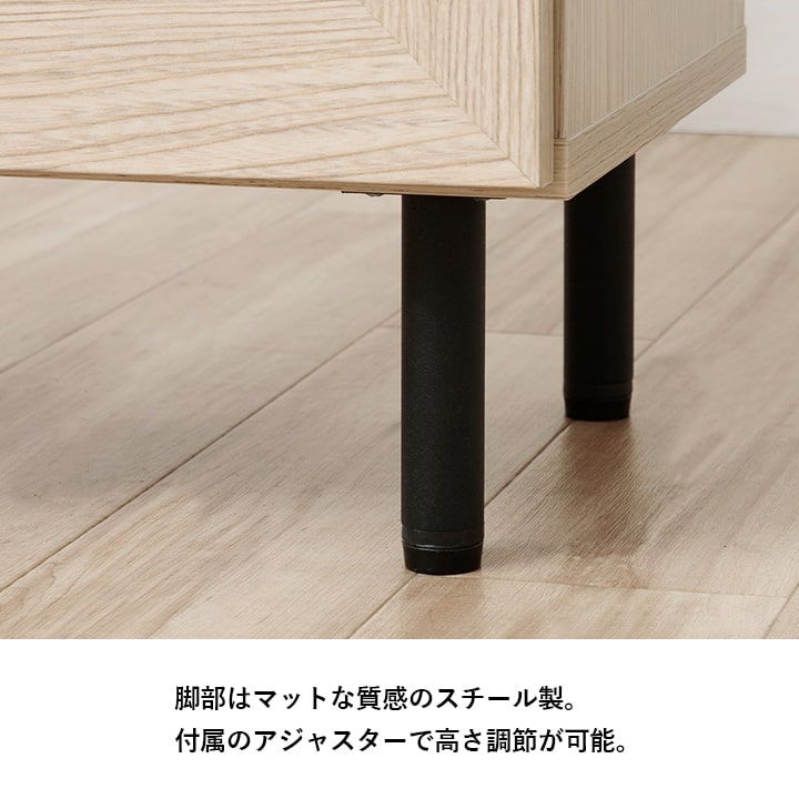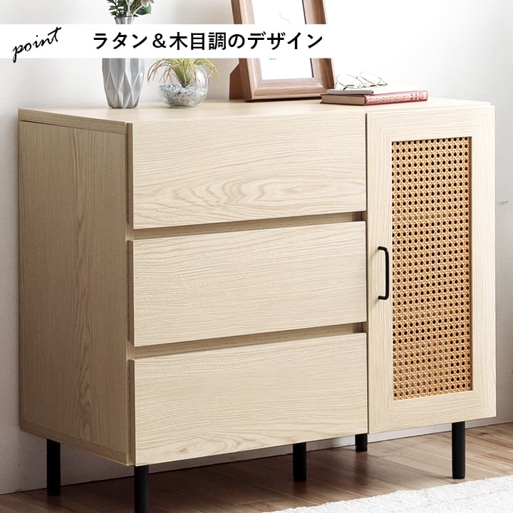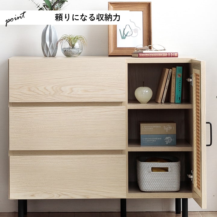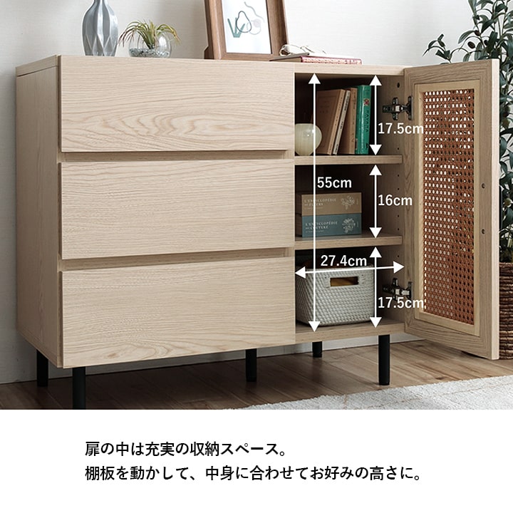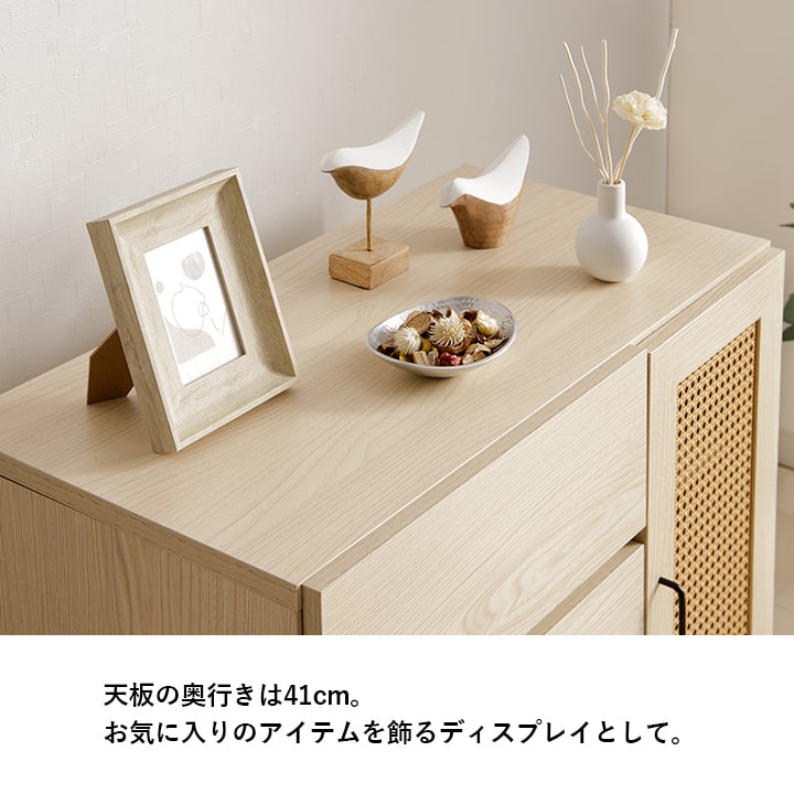 | ■ お部屋に自然と馴染む、おしゃれな「かごめ編み」のラタン調チェスト。 ■ 扉内の収納は、3cm間隔で調整できる可動棚になっており、用途に応じて高さを変更可能。 ■ 大容量の引き出しが3個付いているため、さまざまな用途にお使いいただけます。 ■ 天板の奥行きは40cmあり、ディスプレイスペースとしても使用可能。 ■ 脚部はマットな質感のスチール製。付属のアジャスターにより高さ調整ができます。 ■ 本製品はお客様ご自身での組立が必要です。 ■ 耐荷重は全体で約30kg、天板部分は約10kg、その他の板は約5kgです。 |