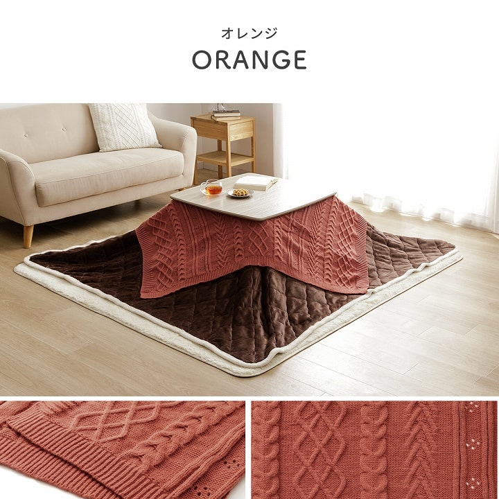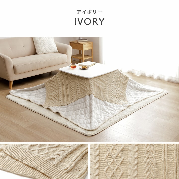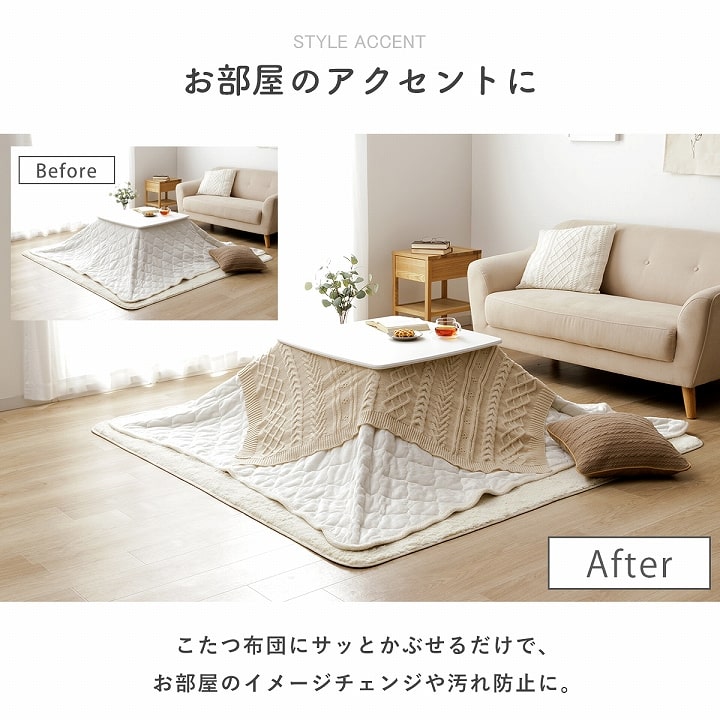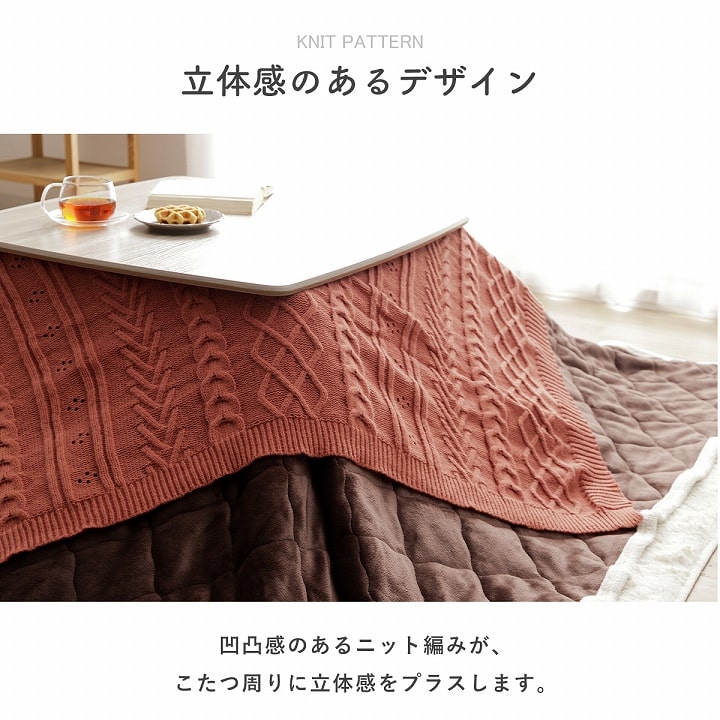 | ■ こたつ布団にサッとかぶせるだけで、手軽にお部屋のイメージチェンジ&汚れ防止。 ■ 凹凸感のあるニット編みが、こたつ周りに立体感をプラスします。 ■ ご自宅の洗濯機で丸洗いできるので、いつでも清潔に使えます。(洗濯ネット使用) ■ ソファでくつろぐ時のブランケットや、肌寒い時の防寒アイテムとしても活躍。 ■ リボン付き仕様だから、ギフトにもぴったりです。 |