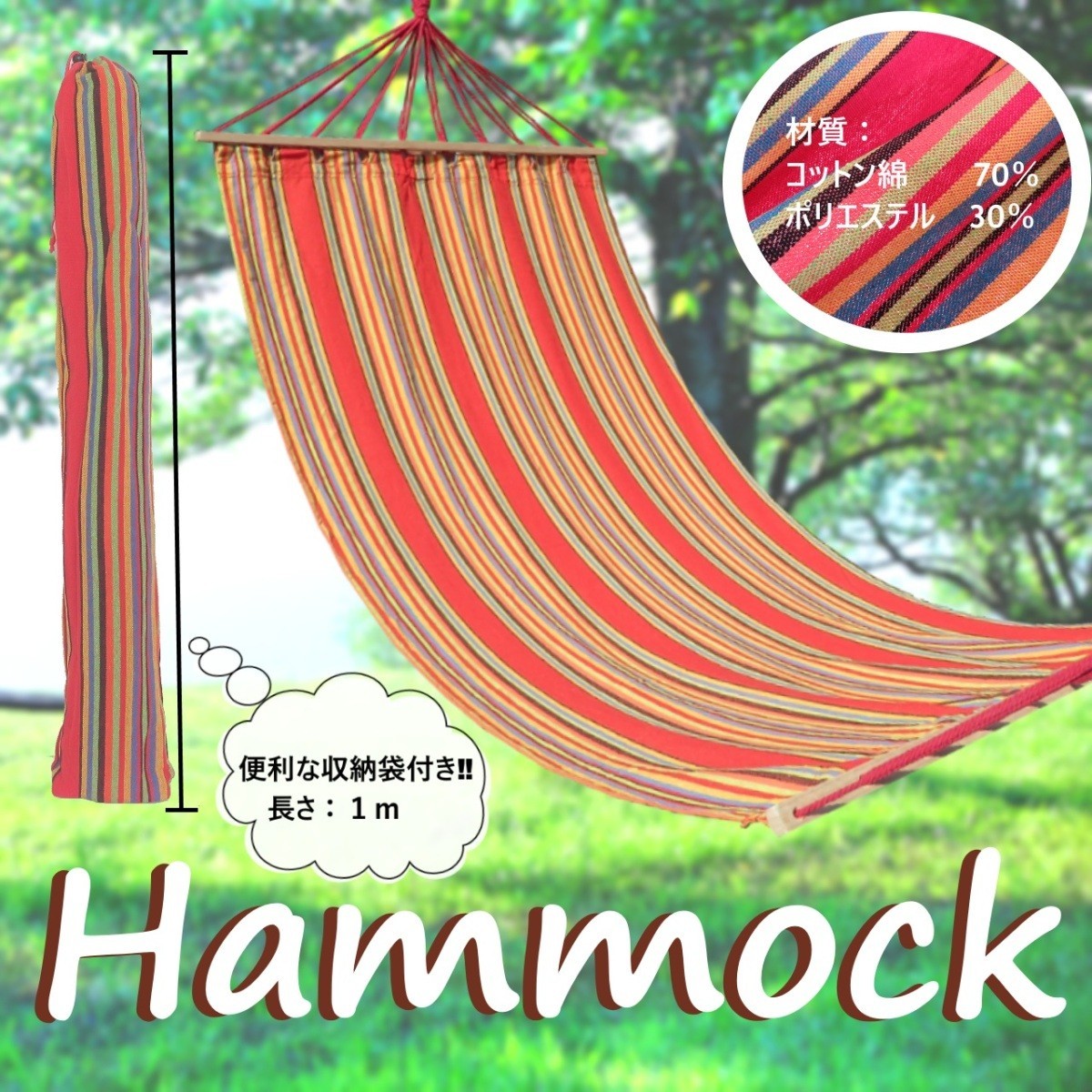 木漏れ日を浴びられる森林で、アウトドアを満喫するなら、ハンモックでゆっくり自然を実感したい。マイホームの庭の一角や、ウッドデッキ、ベランダなどでも、お昼寝タイムにゆらゆら揺れながら過ごすリラックスタイム。両端に木製枠があるタイプです。ハンモック本体部分の撚れがないため、広々とお使いいただけます。ご使用後は、小さく折りたたんで、場所を取らずに収納できます。材質:コットン綿70%、ポリエステル30%、両端木製枠2本生地サイズ:幅100 × 長さ200cm紐部分を含む全長:280cm付属品:収納袋キャリーバッグ×1(ハンモック取付用のカナビラ等は付属いたしませんので、ご使用の際にご用意ください。)注意事項・ハンモックを設置する場所の強度には十分ご注意下さい。・設置が禁止されている所ではご使用はお控え下さい。・ハンモックのご使用はお客様の判断で行って下さい。