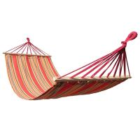 木漏れ日を浴びられる森林で、アウトドアを満喫するなら、ハンモックでゆっくり自然を実感したい。マイホームの庭の一角や、ウッドデッキ、ベランダなどでも、お昼寝タイムにゆらゆら揺れながら過ごすリラックスタイム。両端に木製枠があるタイプです。ハンモック本体部分の撚れがないため、広々とお使いいただけます。ご使用後は、小さく折りたたんで、場所を取らずに収納できます。材質:コットン綿70%、ポリエステル30%、両端木製枠2本生地サイズ:幅100 × 長さ200cm紐部分を含む全長:280cm付属品:収納袋キャリーバッグ×1(ハンモック取付用のカナビラ等は付属いたしませんので、ご使用の際にご用意ください。)注意事項・ハンモックを設置する場所の強度には十分ご注意下さい。・設置が禁止されている所ではご使用はお控え下さい。・ハンモックのご使用はお客様の判断で行って下さい。