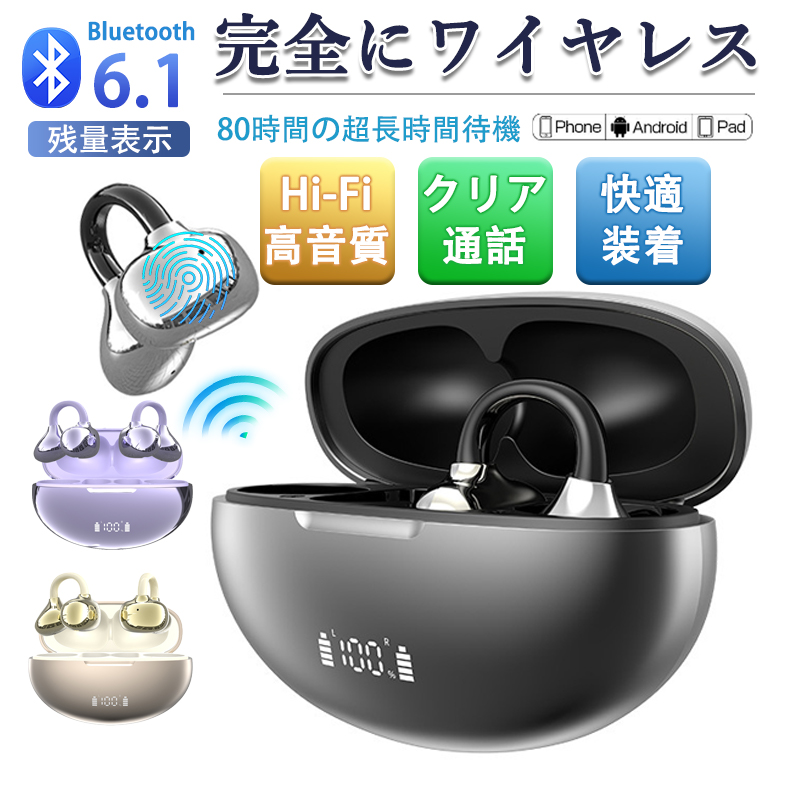 | オススメポイント | 耳をふさがないケーブルもない最高に自由なイヤホン! 【骨伝導イヤホン】 どんな耳の形にもフィットするイヤーカフ構造の骨伝導イヤホンは、一般の耳かけ式と違って、耳介に挟むように装着します。イヤホンが入りにくい耳穴でも問題なし!骨伝導イヤホンは耳をふさがないので、テレワーク・スポーツ・移動中など、全ての場面でながら聴きしながら作業可能です。また、左右完全分離に進化しました。 【クリア音質】 風切り音や環境音などのノイズを低減できるマイクを搭載しているため、通常のキャリア通話はもちろん、LINE通話などといったSNS系通話アプリによる通話やコロナ禍において定着してきたオンライン会議による通話も快適に出来ます。 【耳が痛くならないイヤホン】 耳たぶを横から挟み込むクリップ型の片耳イヤホンなので、耳に入る必要はありません、耳の形に関わらずどなたでも同じように装着する事ができます。 本体はわずか5gで、付けていることを忘れてしまう程の装着感、長時間に使っても負担与えません。 また、安定に装着できるフィット構造のイヤーフックは肌に優しいABS素材で作られ、柔らかい装着感を実感できます。 【スポーツに最適】 耳に優しい材料が採用され、ソフトながらホールド力があり、 頭を左右に振ったり力んだりしても外れることはありません。 筋トレなどの激しく身体を動かすトレーニング時にも安心の装着感を実現!安心してご利用いただけます。 【IPX5完全防水】 IPX5優れた防水性能により、お風呂、キッチン、又は海、プール等でも水濡れを心配することなく音楽を楽しめます。 ※ご注意:全体水洗い掃除をしないでください。 |