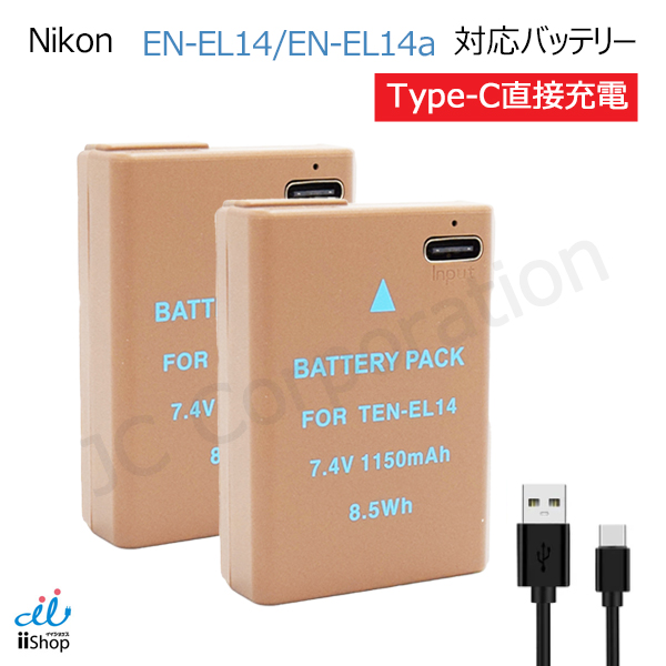 【2個セット】バッテリーに直接充電可 Nikon対応 EN-EL14 EN-EL14A 対応バッテリー 残量表示可 Type-cポート付 充電器不要 コード:08025-x2