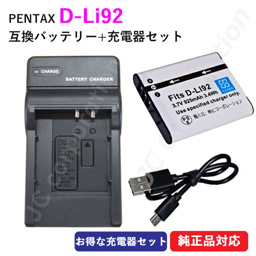 充電器セット ペンタックス(PENTAX) D-LI92 / オリンパス(OLYUMPUS) Li-50B 互換バッテリー + 充電器 (USBタイプ) コード 00838-00906