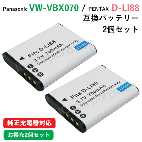 2個セット パナソニック(Panasonic) VW-VBX070 / ペンタックス(PENTAX) D-LI88 互換バッテリー コード 01552-PA-x2