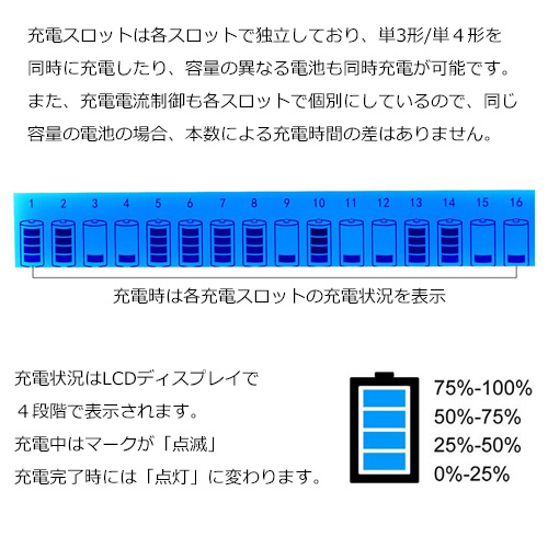 関連ワード: 充電式電池 ニッケル水素電池 充電 単三 乾電池 ニッケル 単四 単4電池 単三電池 単四電池 単3電池 電池充電器 16本同時 16本充電 16本