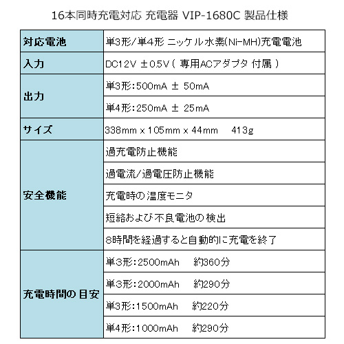 商品名:充電式電池専用急速充電器 VIP-1680C