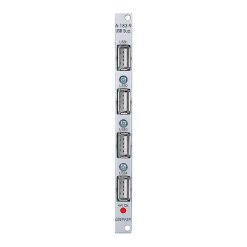 A-183-9 Quad USB Power Supply はキーボードやスマートフォンなど、USB を介して給電するデバイスのための簡易的な電源モジュールです。最大で4台までのデバイスに給電することができます。