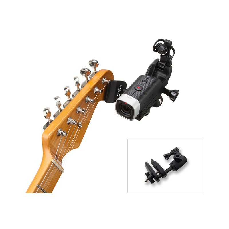 ギターヘッド・マウント『GHM-1』は、『Q4』をギターヘッドにマウントするための別売アタッチメントです。指板を駆け巡るギタリスト/ベーシストの手元にクローズアップした、ミュージックビデオさながらの映像を撮影することができます。