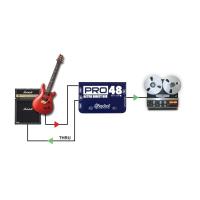ギターをラジアルPRO48等DIの入力に繋ぎます。バランス・アウトからレコーダーに繋ぎドライ・トラックを録音します。PRO48のTHRU OUTからギターアンプに繋げばギタリストはアンプからの音を聞きながらプレイできます。