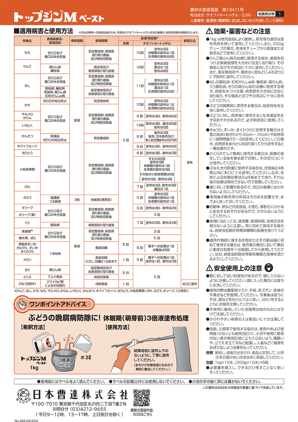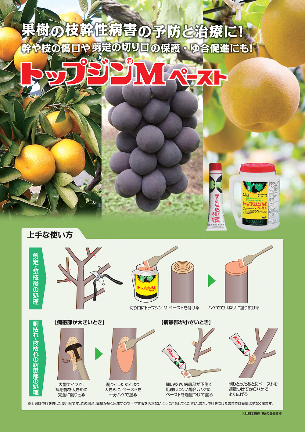 製品特長病患部を削り取った後の傷口、剪定・整枝・環状はく皮時の切り口などに本剤を塗布すると、有効成分チオファネートメチル含有の耐雨性の安定した殺菌保護被膜が速やかにでき、木質部の亀裂、雨水や雑菌の侵入を防ぎ、新しいカルス(ゆ合組織)の形成を促進し、病害の感染を防ぎます。