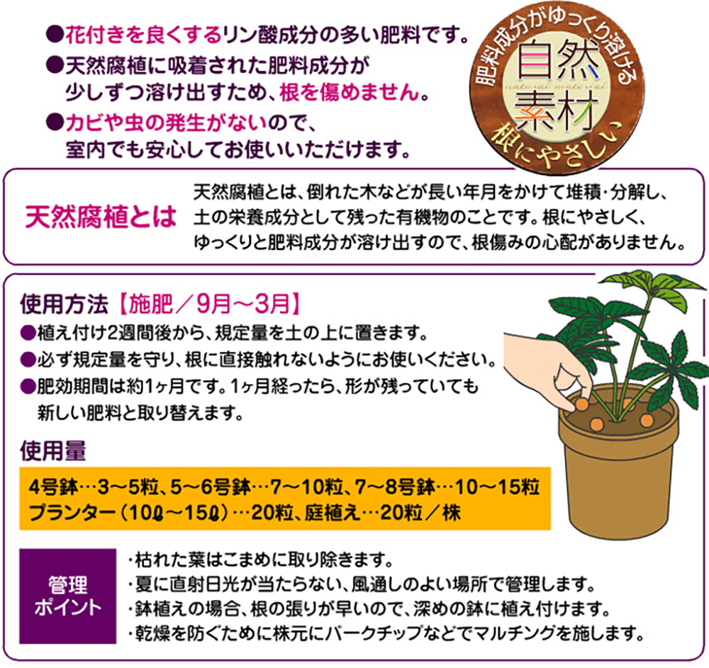 花ごころ クリスマスローズの肥料■花付きを良くするリン酸成分の多い肥料です■天然腐植に吸着された肥料成分が、少しずつ溶け出すため、根を痛めません■カビや虫の発生がないので、室内でも安心してお使いいただけます