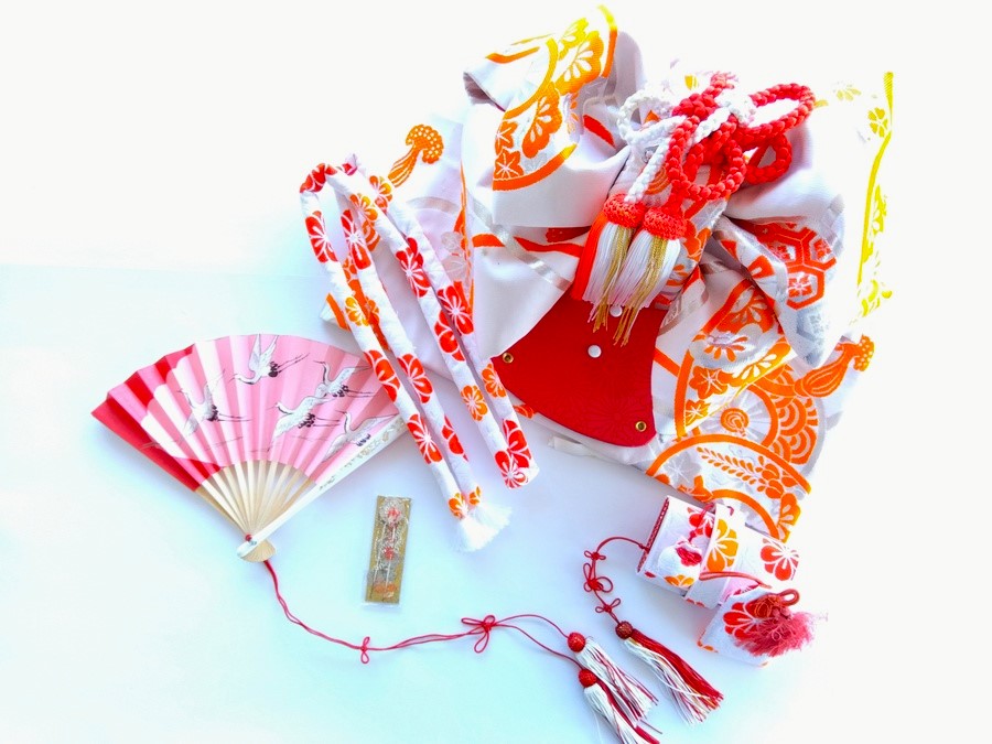 リサイクル品 結び帯(作り帯) 七五三 7才 女の子 白地銀朱赤 6点セット 985 ggp