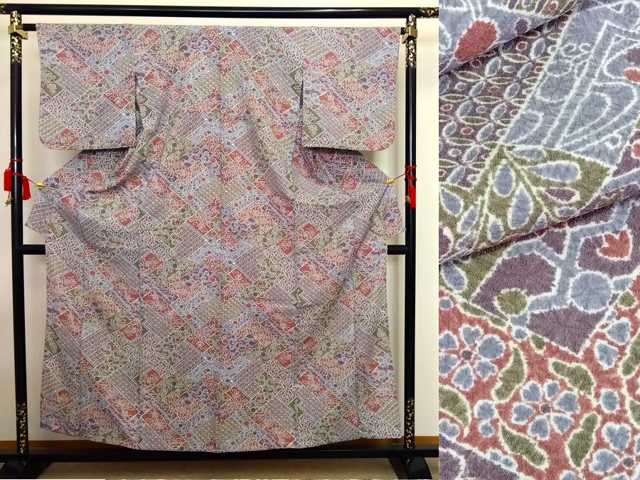 中古 リサイクル 洗える着物 単衣仕立て 化繊 ちりめん グレー短冊 着丈153.5cm 908 ggp