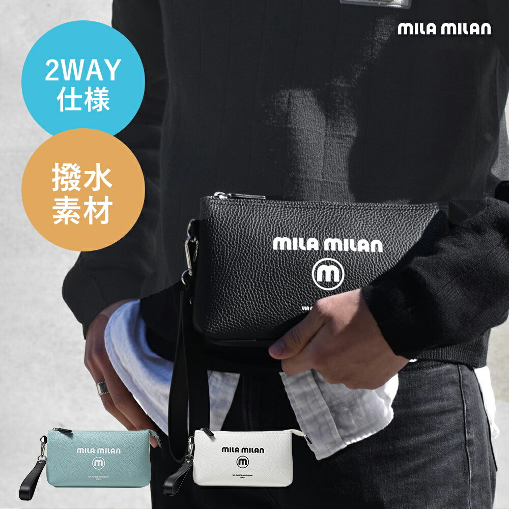 モノトーン調にブランドロゴがポイントのミラ・ミランのクラッチバッグ。取り外し可能な持ち手で2WAY仕様。バッグインバッグとしてもお使いいただけます。本体生地は防水機能のあるPVCを使用しております。一見シンプルなバッグに見えますが、内装にはブランドイメージのストライプ柄を施すなどのこだわりも。男性、女性どちらもお使いいただけるバッグです。