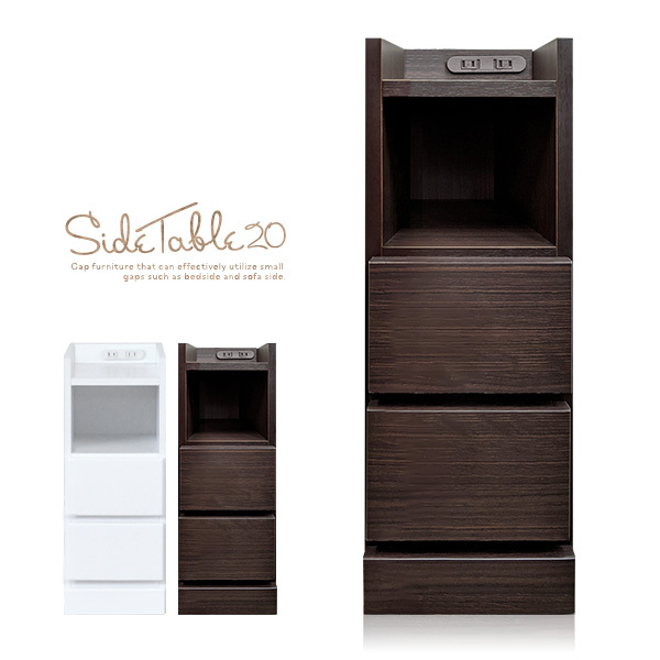 すきま収納 ナイトテーブル 幅20cm 完成品 コンセント付 スリム ホワイト 白 サイド ベッド ソファ ブラウン おしゃれ 引き出し 隙間