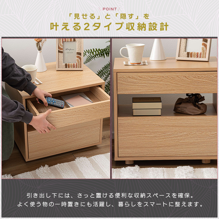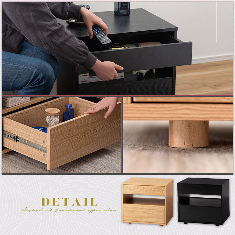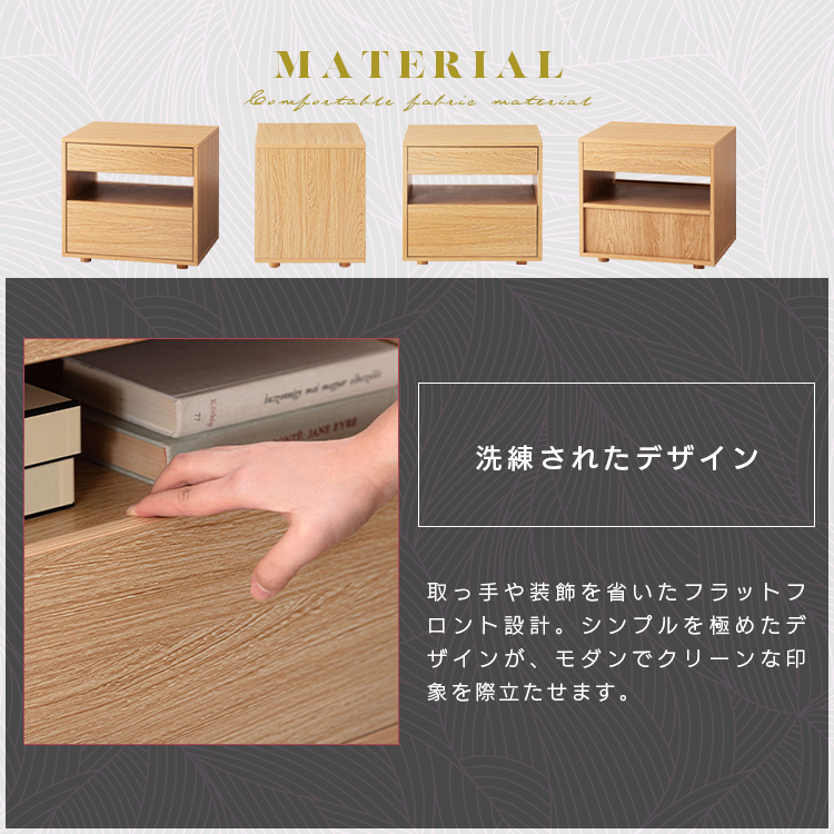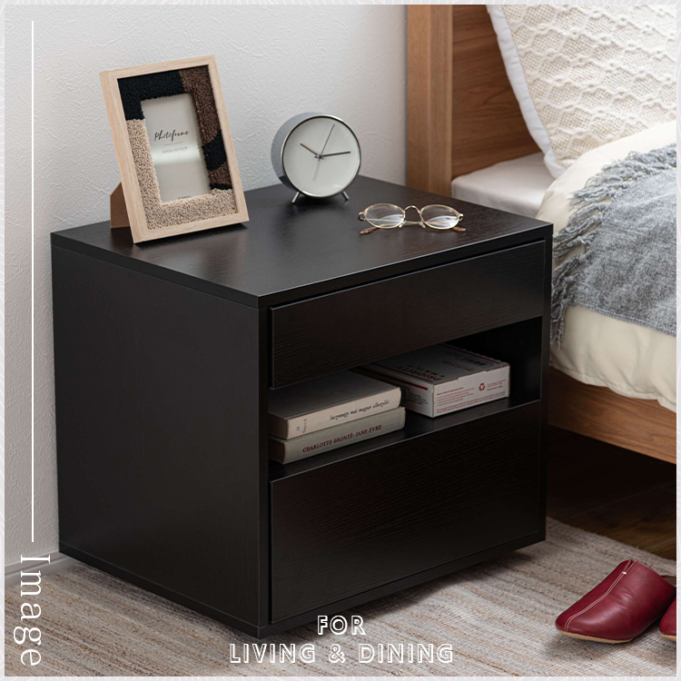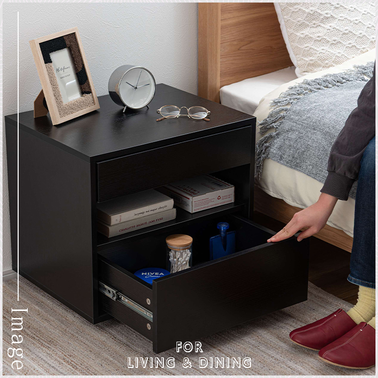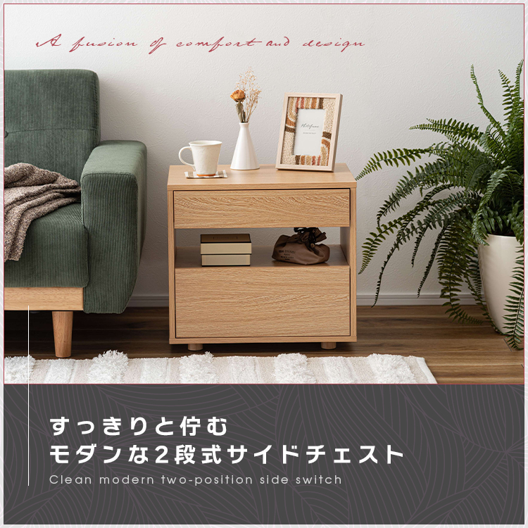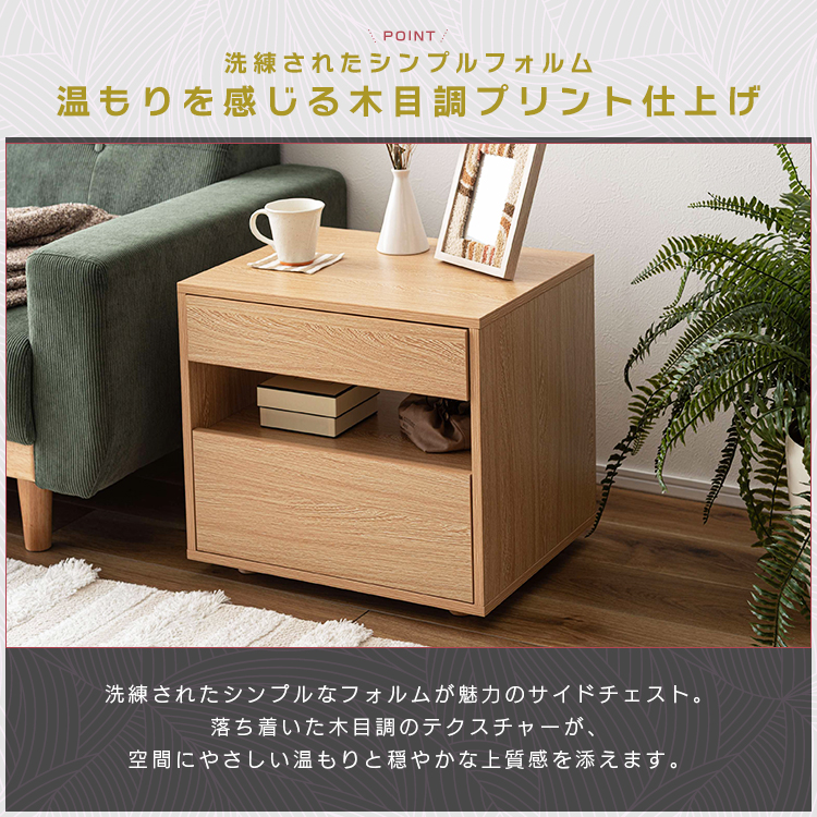 | 特徴 | すっきりと置けるモダンな2段式収納洗練されたシンプルなフォルムが魅力のサイドチェスト。 落ち着いた木目調のテクスチャーが、お部屋にやさしいぬくもりと穏やかな上質さを添えます。モダンな佇まいがリビングやベッドサイドなど様々な空間になじみ、心地よい統一感をもたらします。上下2段の引き出しは収納性に優れ、デザイン性と機能性を兼ね備えたアイテムです。 ●たっぷりと収納できる2段の引き出し付 ●スムーズに引き出せるスライドレールを使用 ●引き出し下にも収納を完備 ●美しい木目調のボディ |