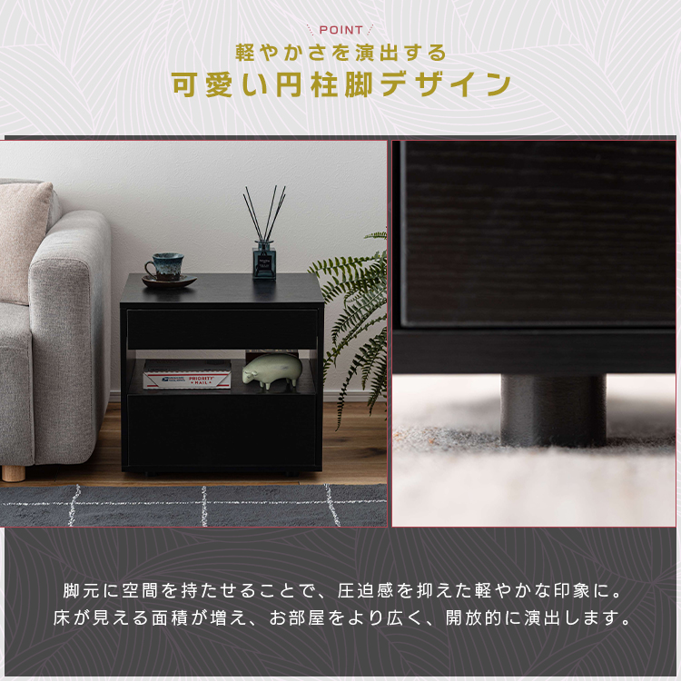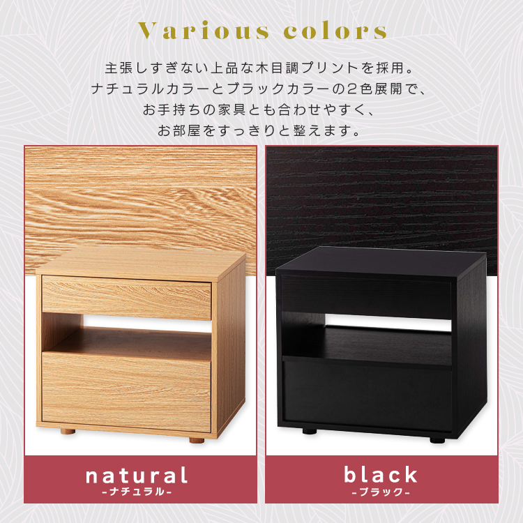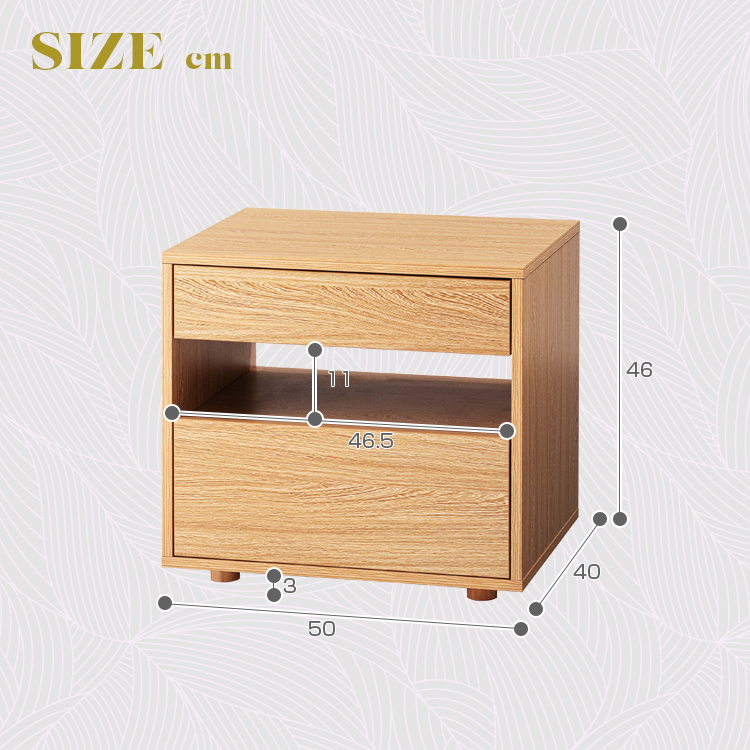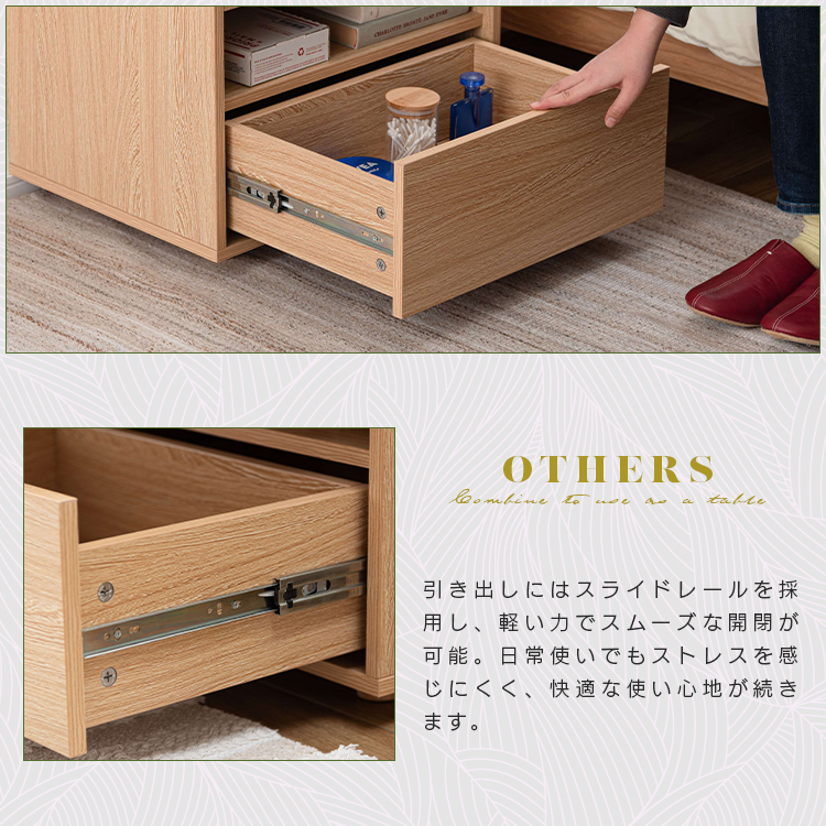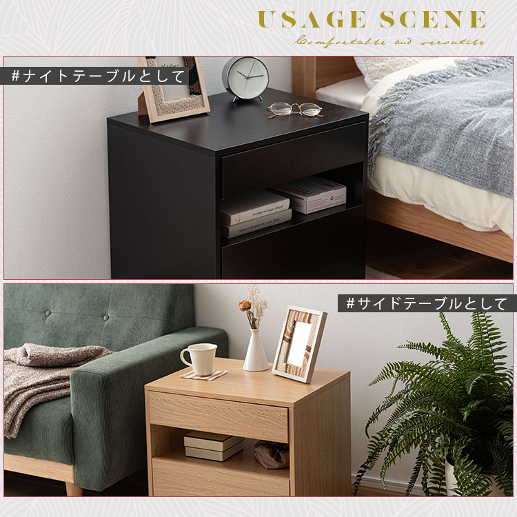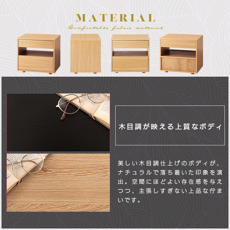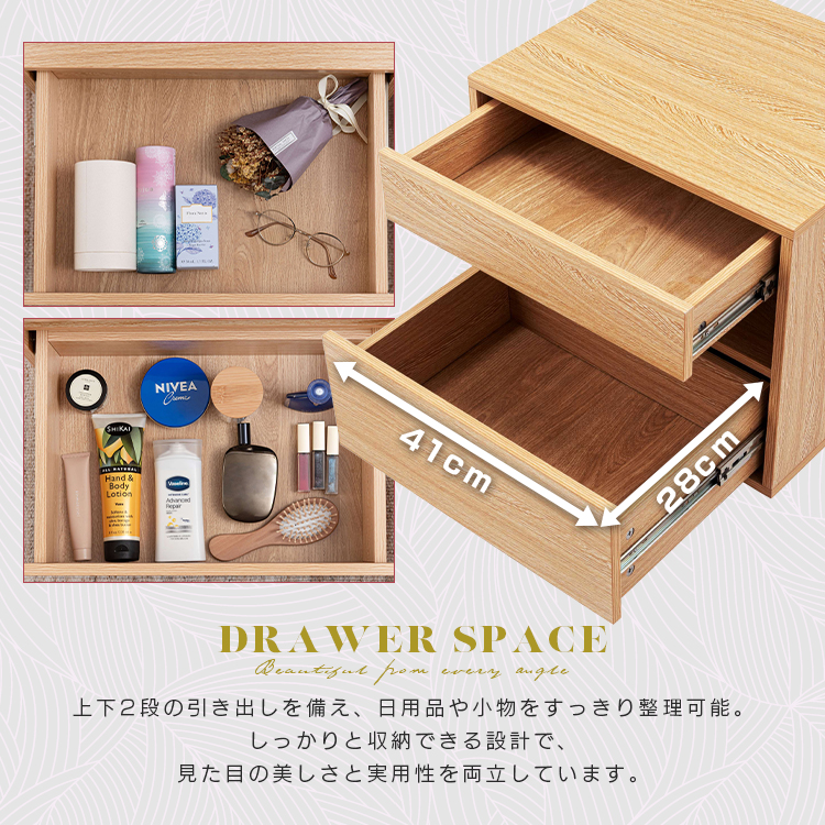 | 特徴 | すっきりと置けるモダンな2段式収納洗練されたシンプルなフォルムが魅力のサイドチェスト。 落ち着いた木目調のテクスチャーが、お部屋にやさしいぬくもりと穏やかな上質さを添えます。モダンな佇まいがリビングやベッドサイドなど様々な空間になじみ、心地よい統一感をもたらします。上下2段の引き出しは収納性に優れ、デザイン性と機能性を兼ね備えたアイテムです。 ●たっぷりと収納できる2段の引き出し付 ●スムーズに引き出せるスライドレールを使用 ●引き出し下にも収納を完備 ●美しい木目調のボディ |