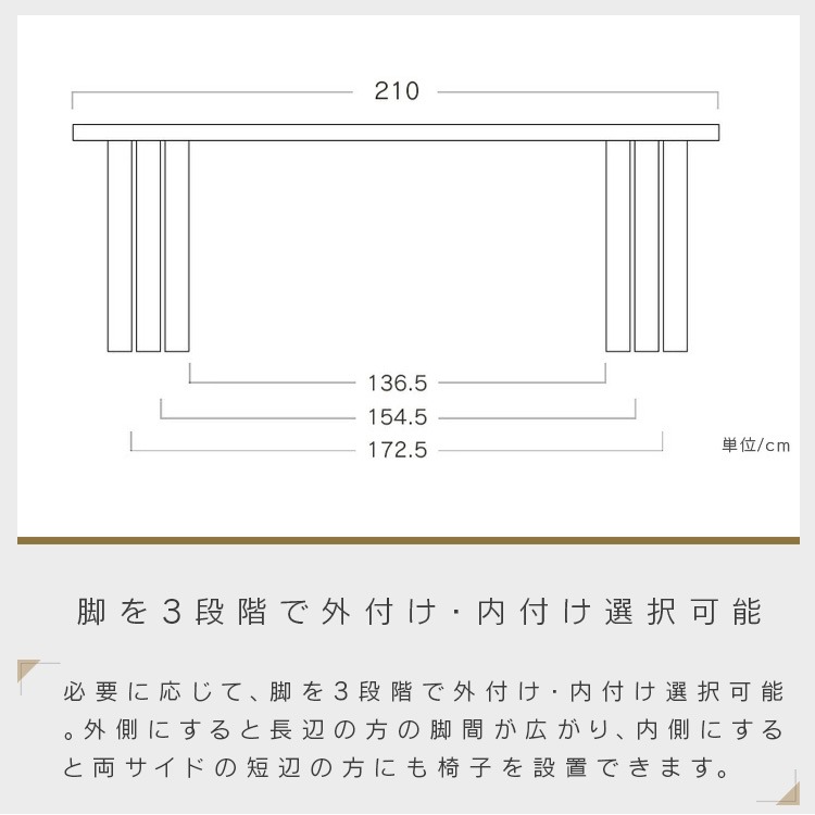 | 備考 | 脚の位置を付け替え可能 輸入品 お客様組み立て式 ※天然木を使用しております為、同じ形状・木目はございません。また、集成ブロック幅も商品により異なります。天板の裏、見えない部分の細かな斑や傷は返品・交換の対象外となります。 ※撮影場所・照明の具合により実物と多少異なるイメージになる場合がございます。 |