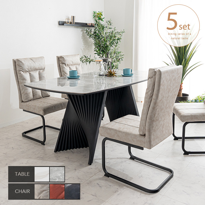 汚れやキズに強いセラミック天板と独創的で芸術性の高い脚のダイニングテーブルにクッション性の高い抜群の座り心地のカンティレバーチェアを合わせたオシャレなダイニング5点セット
