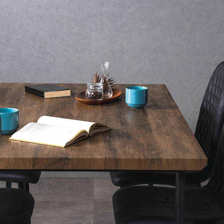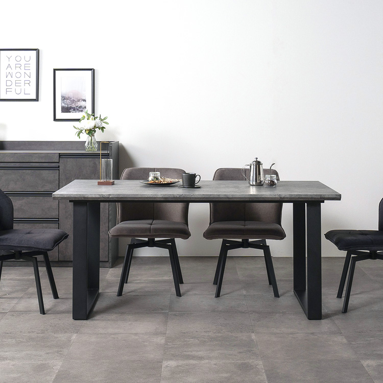 天板は、化粧紙貼りには見えないほどの美しい木目と無機質なコンクリートの質感が表現されています。脚の素材には、強度性の高いスチールを採用。オシャレで美しいデザインのテーブルをリーズナブルなプライスでお求めいただける魅力的なアイテムです。