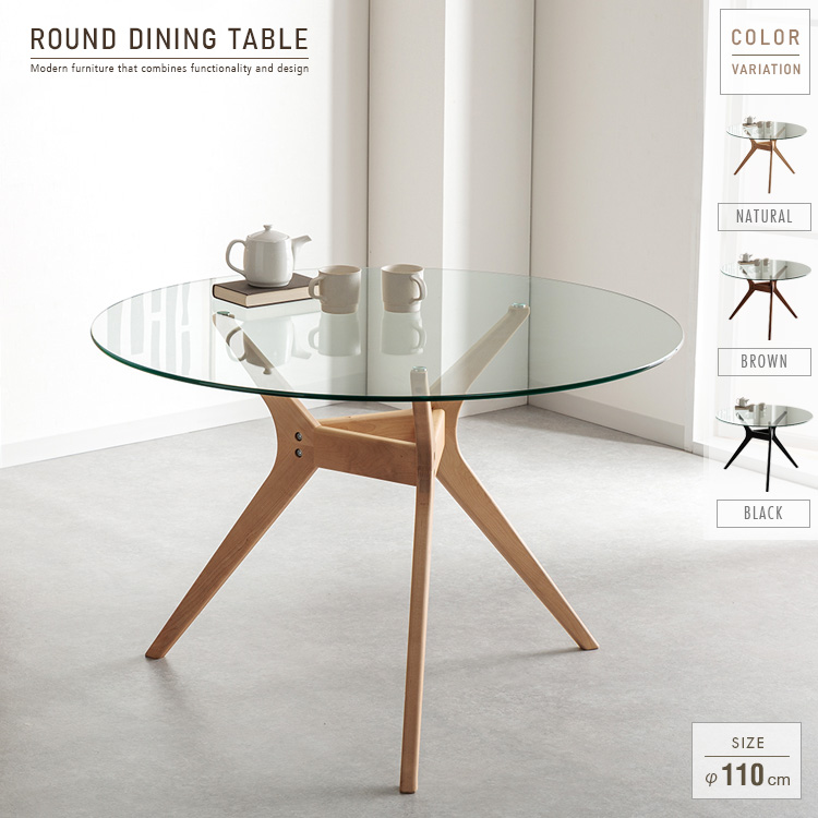 ダイニングテーブル 2人用 丸 ガラス おしゃれ 円形 丸テーブル 2人 110cm テーブル 単品 木製脚 天然木 北欧風 カフェ風 ラウンドテーブル ナチュラル ブラウン ブラック かわいい
