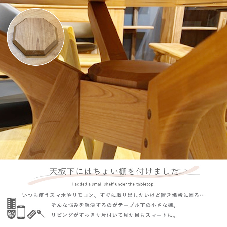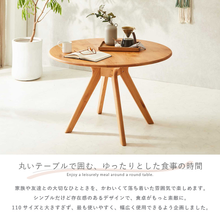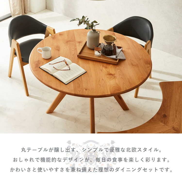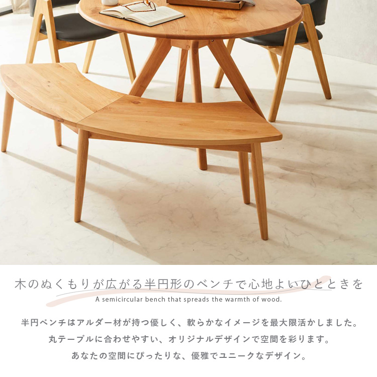 | 特徴 | ・アルダー材の優しい雰囲気を考慮し、コンパクトで可愛いデザインで企画したモデルです。 ・丸テーブルは110サイズと大きすぎず、最も使いやすく、幅広く使用できるよう企画しました。 ・丸テーブルの天板下にはちょい棚を付けました。実用性、デザイン的にもポイントです。 ・半円ベンチはアルダー材が持つ優しく、軟らかなイメージを最大限活かしました。 ・チェアは肘付きで、座面と背もたれは汚れに強いPVCを使用。 ・チェアの脚部フレーム部のみラバーウッド材を使用しております。 |