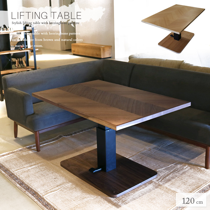昇降式テーブル おしゃれ リビング リフティングテーブル ヘリンボーン柄 120cm ブラウン ナチュラル 高さ調節 デスク ソファテーブル ダイニングテーブル gkw