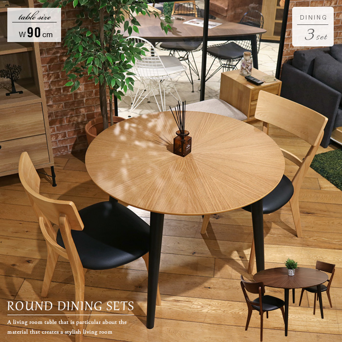 家カフェスタイルのお部屋に最適な円形ダイニング3点セット。2色展開なのでナチュラルタイプや北欧風のお部屋から落ち着いたカラーのアンティーク風のお部屋まで対応します。