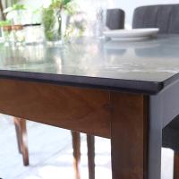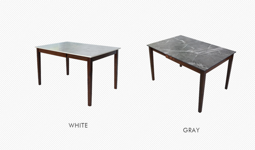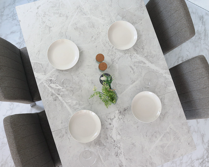 デザイン性の高い石目模様のメラミン天板は、料理を華やかに美しく演出してくれるのはもちろん、毎日ハードに使用するダイニングシーンにおいて高い耐久性を兼ね備えております。