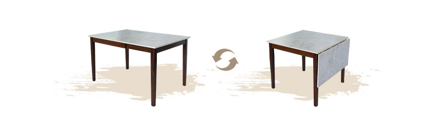 | 特徴 | メラミン天板を使用した 石目模様が美しい大理石風のダイニングテーブル。天板はバタフライ伸長式で80cmから120cmへ拡張可能。 |