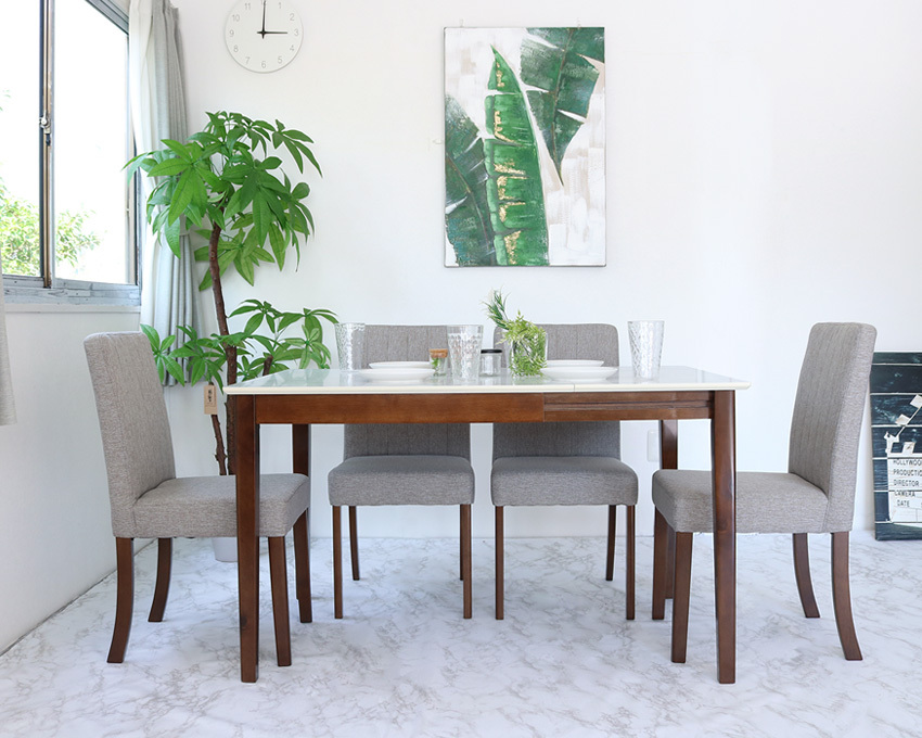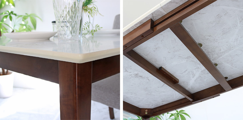 熱やキズ、汚れに強い耐久性のあるメラミンを使用した美しい石目模様の大理石調天板が魅力の伸長式ダイニングテーブル!