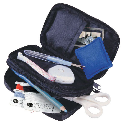 ●内容/布製ポーチ、ピンクッション、ステンレスはさみ、自動巻メジャー、チョークペンシル、ポリエステルスパン糸4色(カード巻)、ニードルセット、リッパ―、糸通し●サイズ/90×130×40mm