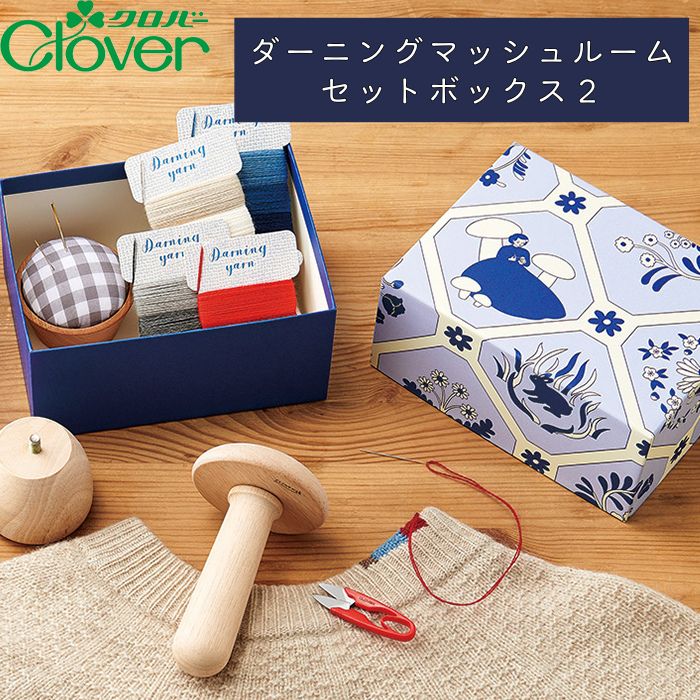 ●セット内容/ダーニングマッシュルーム(かさ・ハンドル・台座 各1個)、手芸針[ケース入] (中細毛糸用・合細毛糸用・極細毛糸用の3種類 各1本)、糸切はさみ、リングゴム(1個)、ダーニング糸 (3色巻・4種類 各1個)、収納ボックス(1個)、説明書