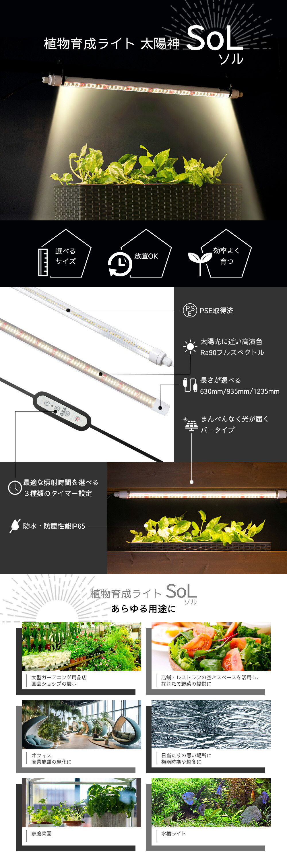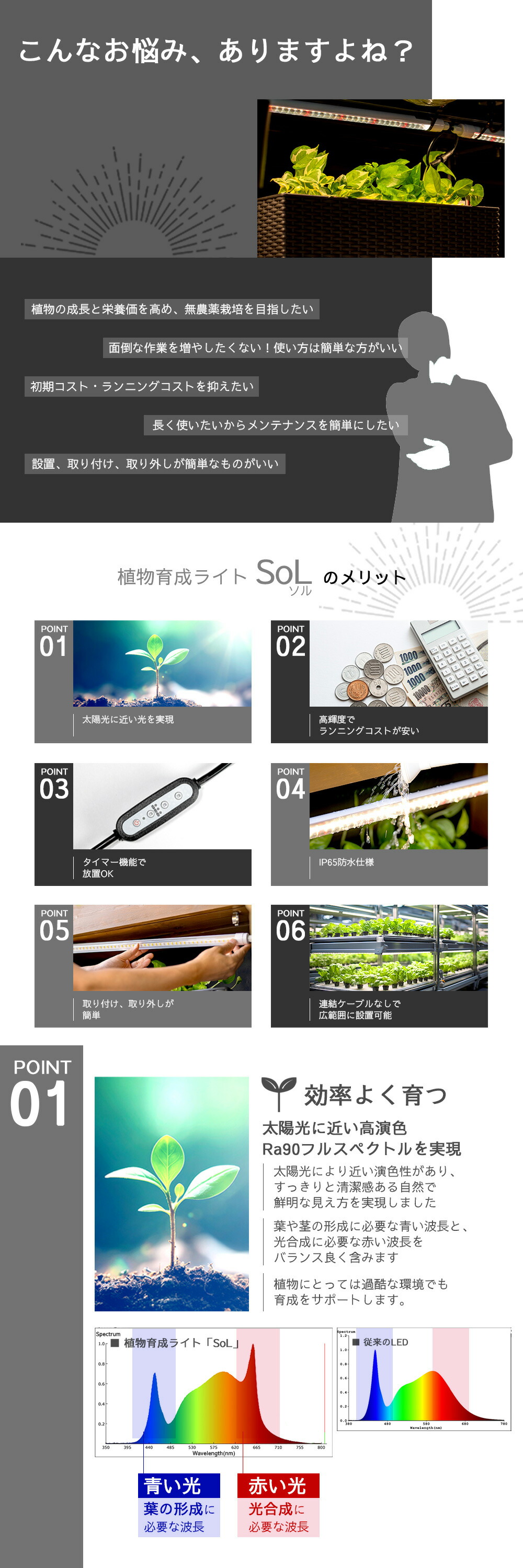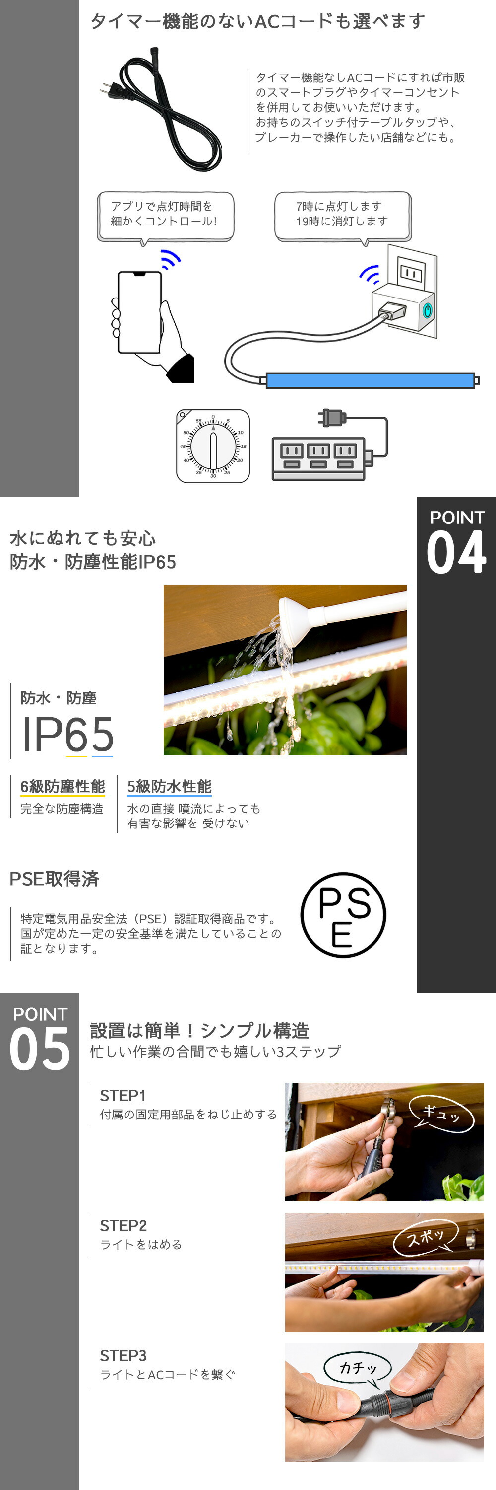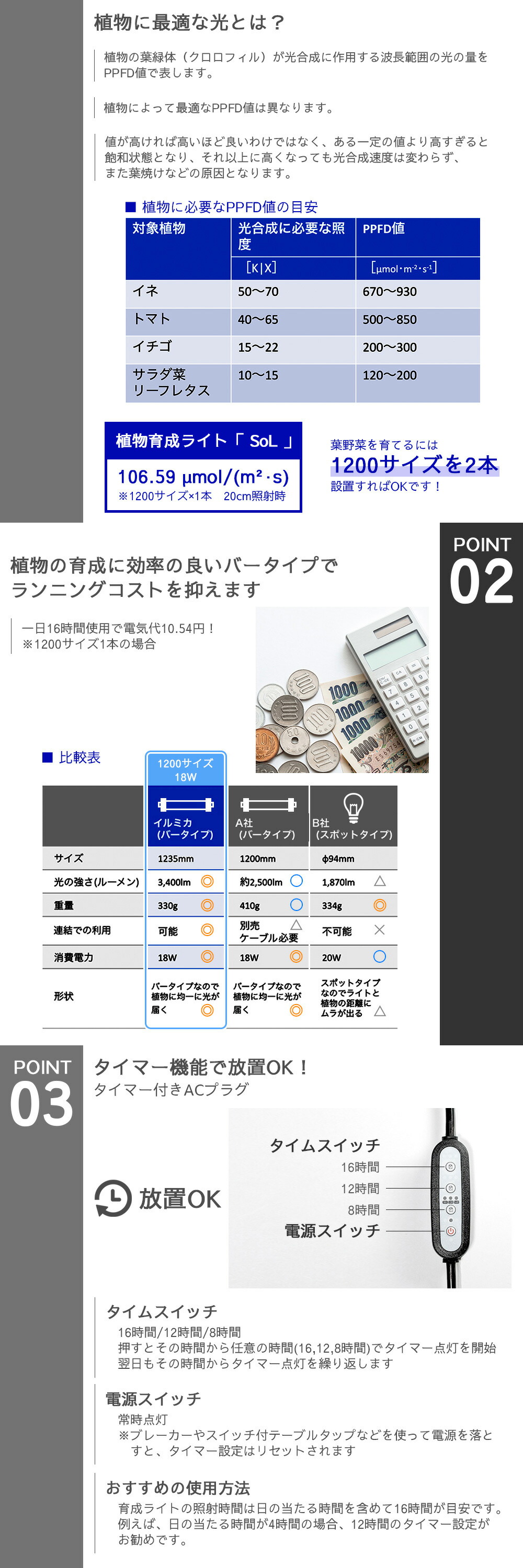 タイマー機能で照射時間をコントロール 天候に左右されない安定した栽培をサポートします