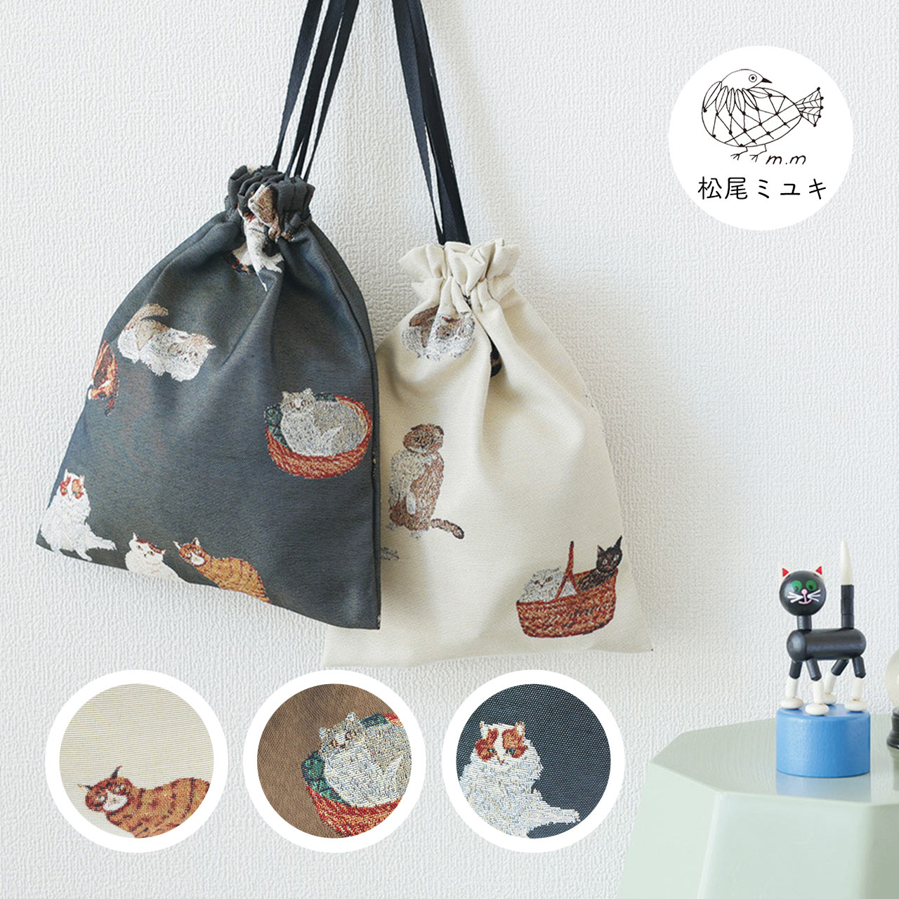 書籍や雑誌のイラストを手掛ける、松尾ミユキさんの猫のイラストが巾着バッグになりました。